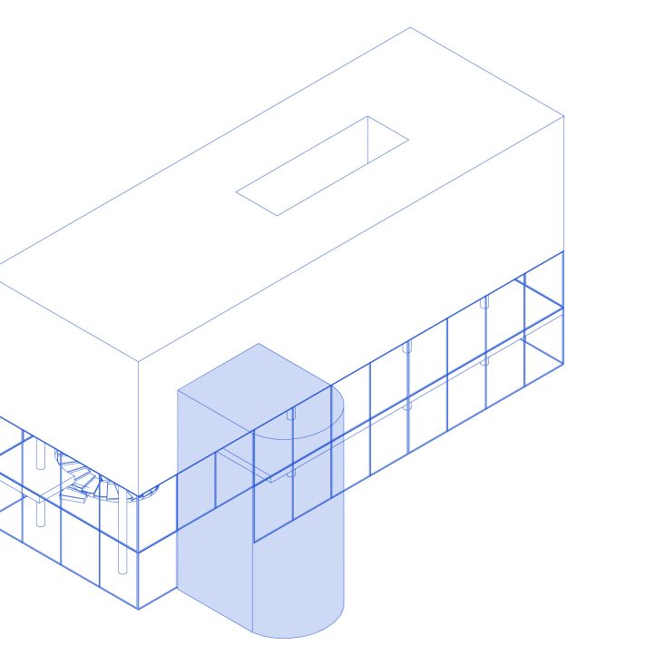 Secondary elements should appear differentiated and not integrated into the main building volume, not to detract from the clarity of the volume. They can be expressed in a distinct architectural language to clearly show their purpose.