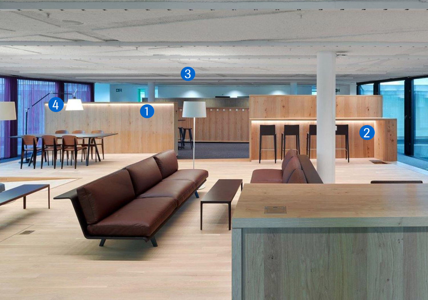 A concise lighting concept is instrumental for the specific use and atmosphere of the space, as it projects order and rhythm in relationship to building structure, orientation, and spatial emphasis.
