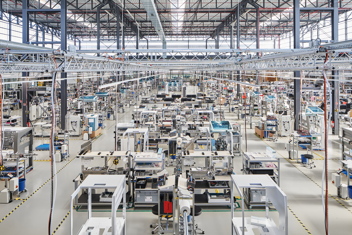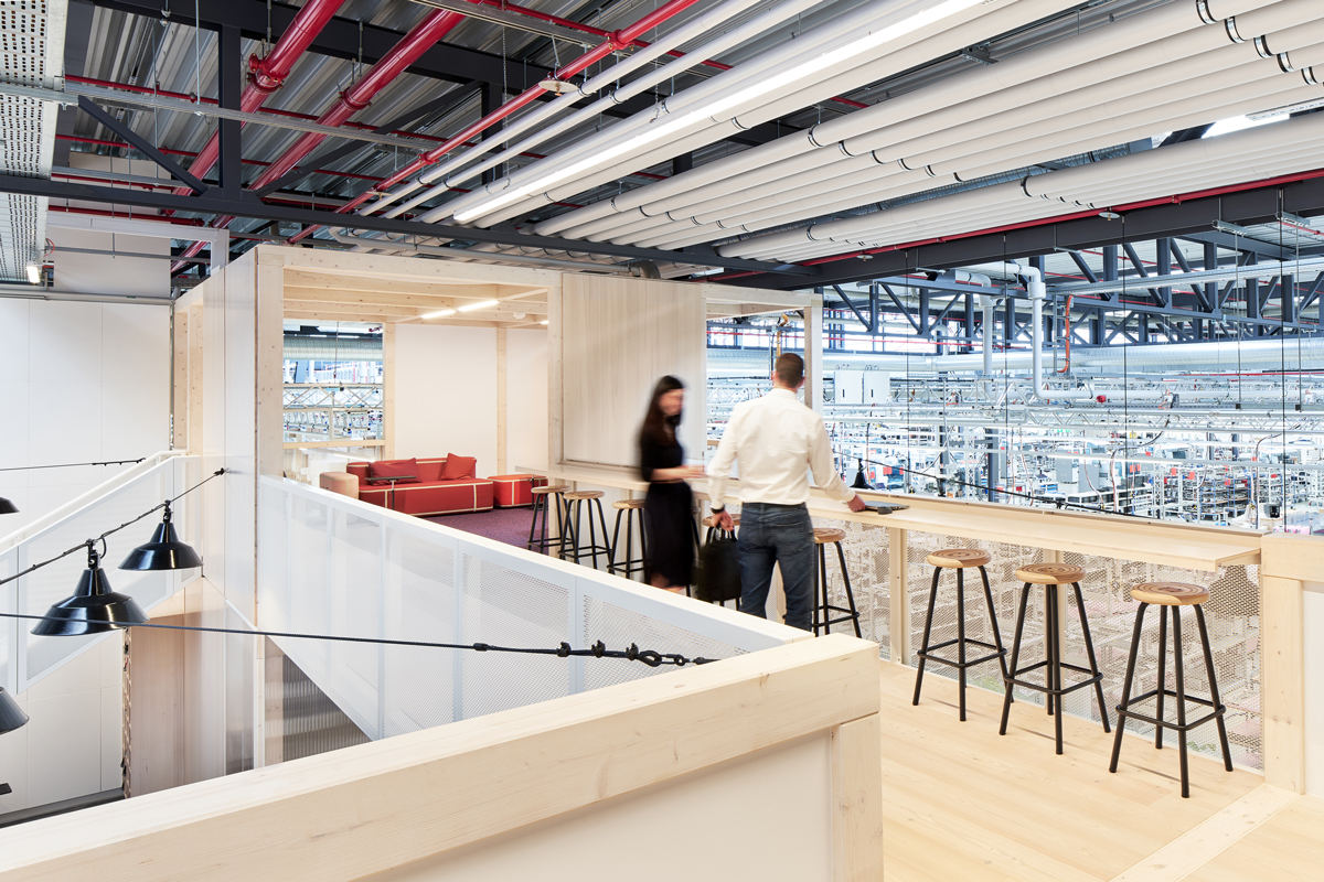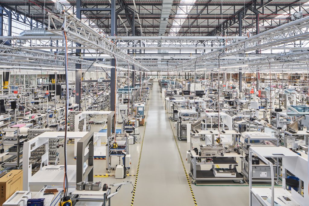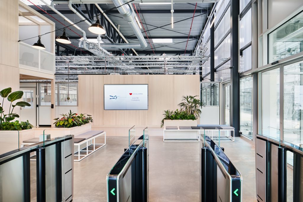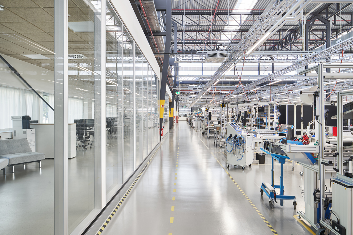 The main industrial hall, originally built in 2003, covers an area of 9,000 m². It has been extensively refurbished and upgraded to accommodate the manufacturing facilities: production, system integration, as well as logistics, quality control and an office zone along the east facade. In addition, following the site’s master plan and design concept, this bright hall becomes the centre piece of the new site, hosting the main entrance, as well as the central communication area, called Herzzone, the main meeting and circulation hub for the entire employee’s community.