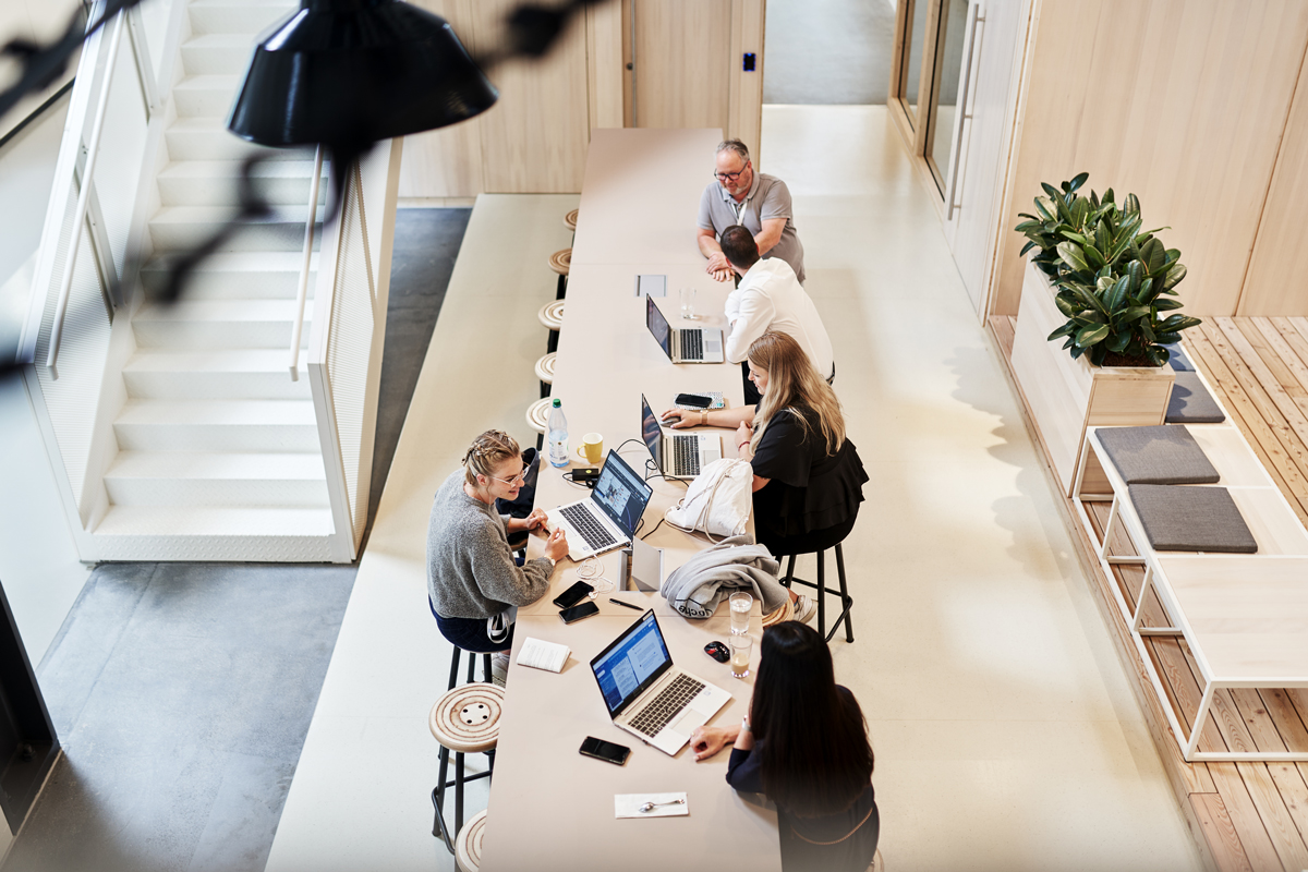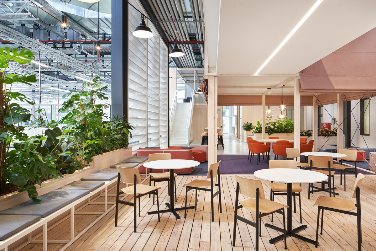 As a result, the designers created a distinctive concept for the Ludwigsburg site that balances between its unique local culture and the iconic aspects of Roche’s global corporate identity. The effect is a distinctive work environment rooted in local character, but unmistakably part of the Roche family. Flexible spaces in open and varied design promote communication & exchange. The combination of natural materials and industrial accents establishes a visual link between office and production areas and symbolizes unity. The use of wood creates a warm atmosphere and underlines the familiar character of the RDA ecosystem.A clear axes runs through the building like boulevards that are reflecting a central element of the baroque city of Ludwigsburg. Bright color accents interrupt the otherwise calm, reduced color concept. The incorporation of plants becomes a key element, influencing the character of the spaces and contributing to people’s well-being.