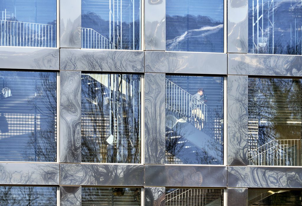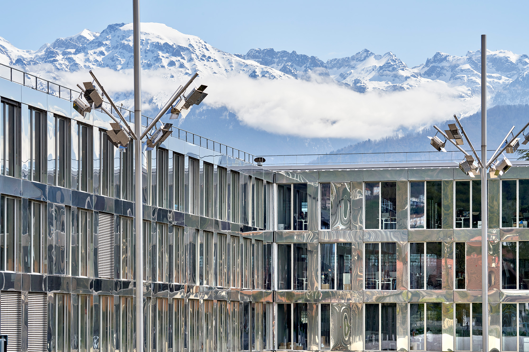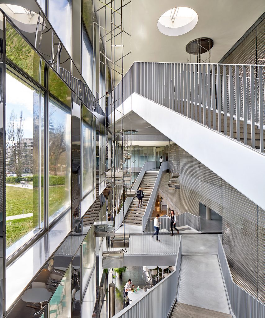 The ground floor, next to the reception, features a «Street Café», where people congregate at the central vertical hub connecting the four floors by a link of transparent stairs set in a space with reflecting stainless steel surfaces and a spectacular view to the mountains. The art installation by Christian Herdeg is a shining elliptic sculpture changing colors every 12 hours and named «Flight through Space and Time».