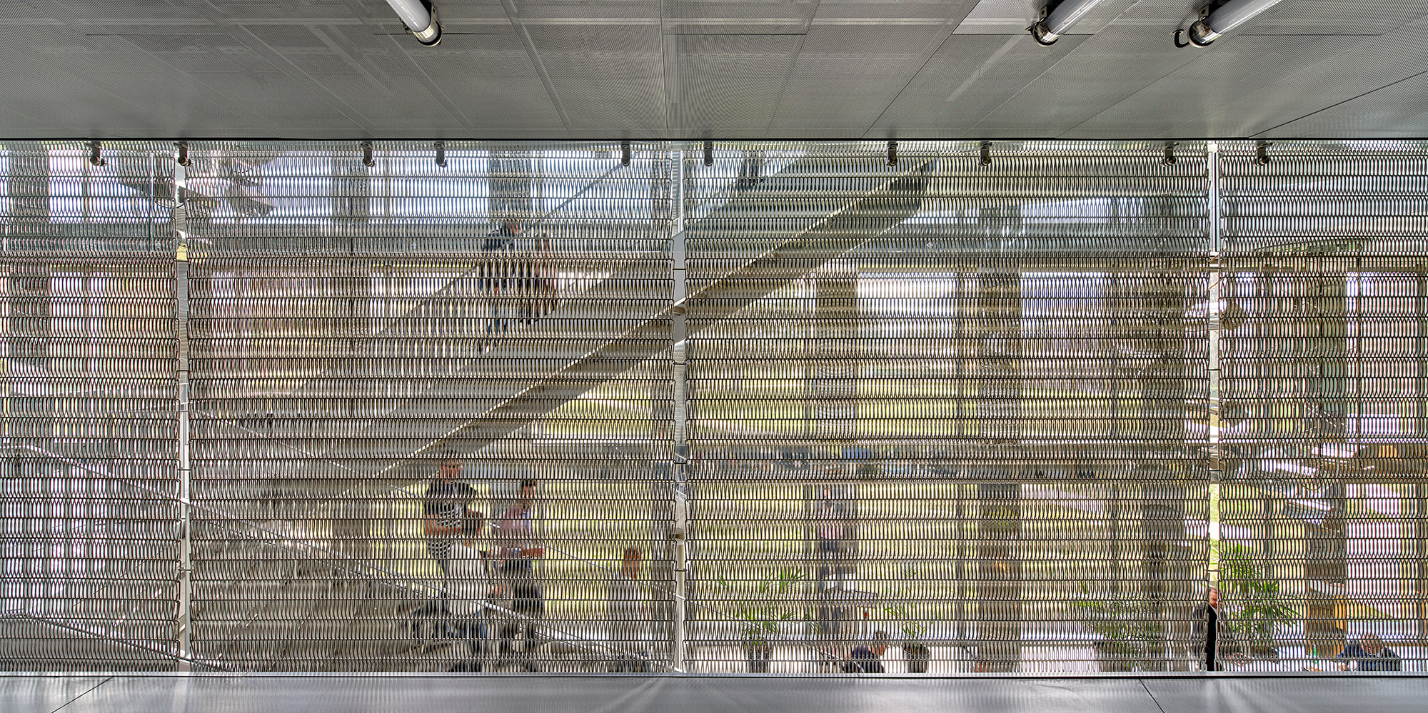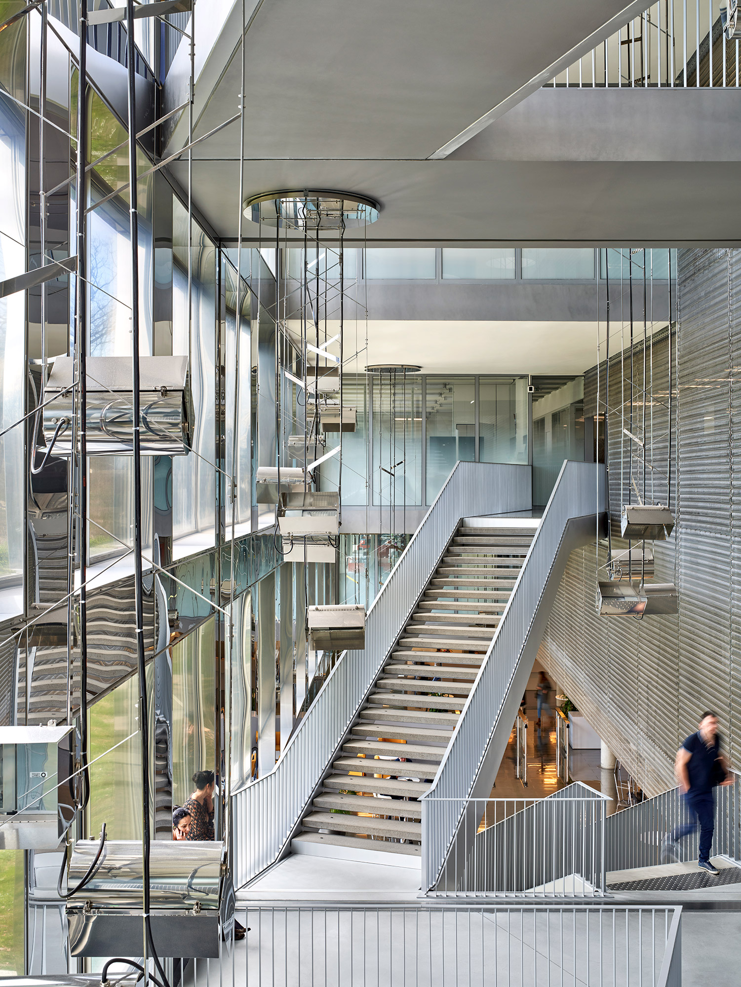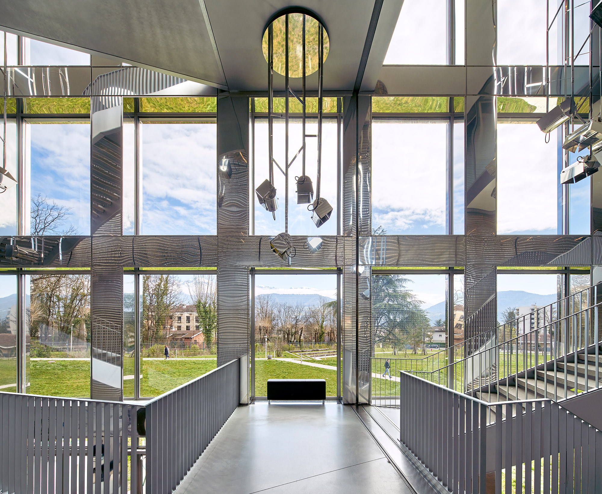 The ground floor, next to the reception, features a «Street Café», where people congregate at the central vertical hub connecting the four floors by a link of transparent stairs set in a space with reflecting stainless steel surfaces and a spectacular view to the mountains. The art installation by Christian Herdeg is a shining elliptic sculpture changing colors every 12 hours and named «Flight through Space and Time».
