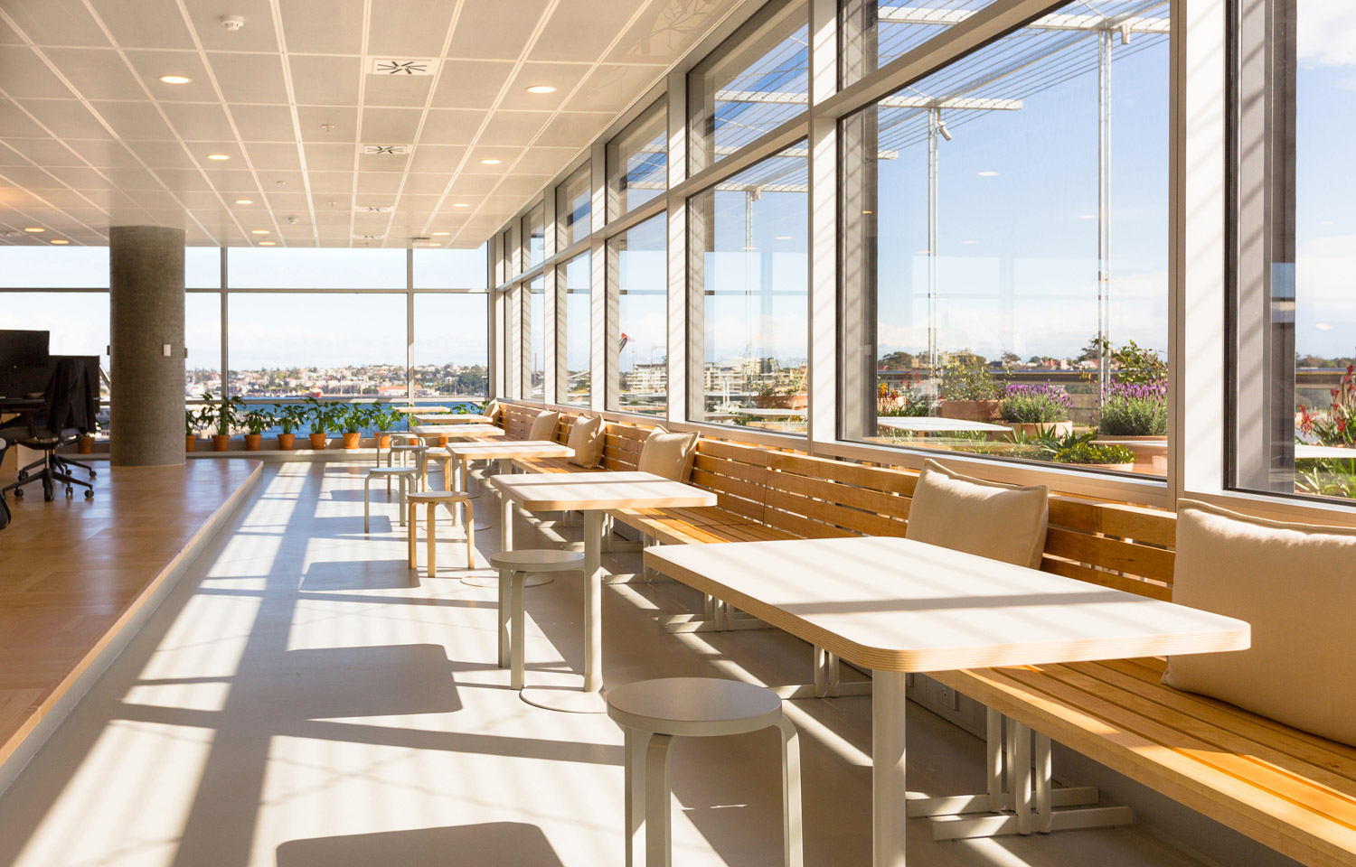- A shaded terrace with flexible seating adjacent to the cafeteria.