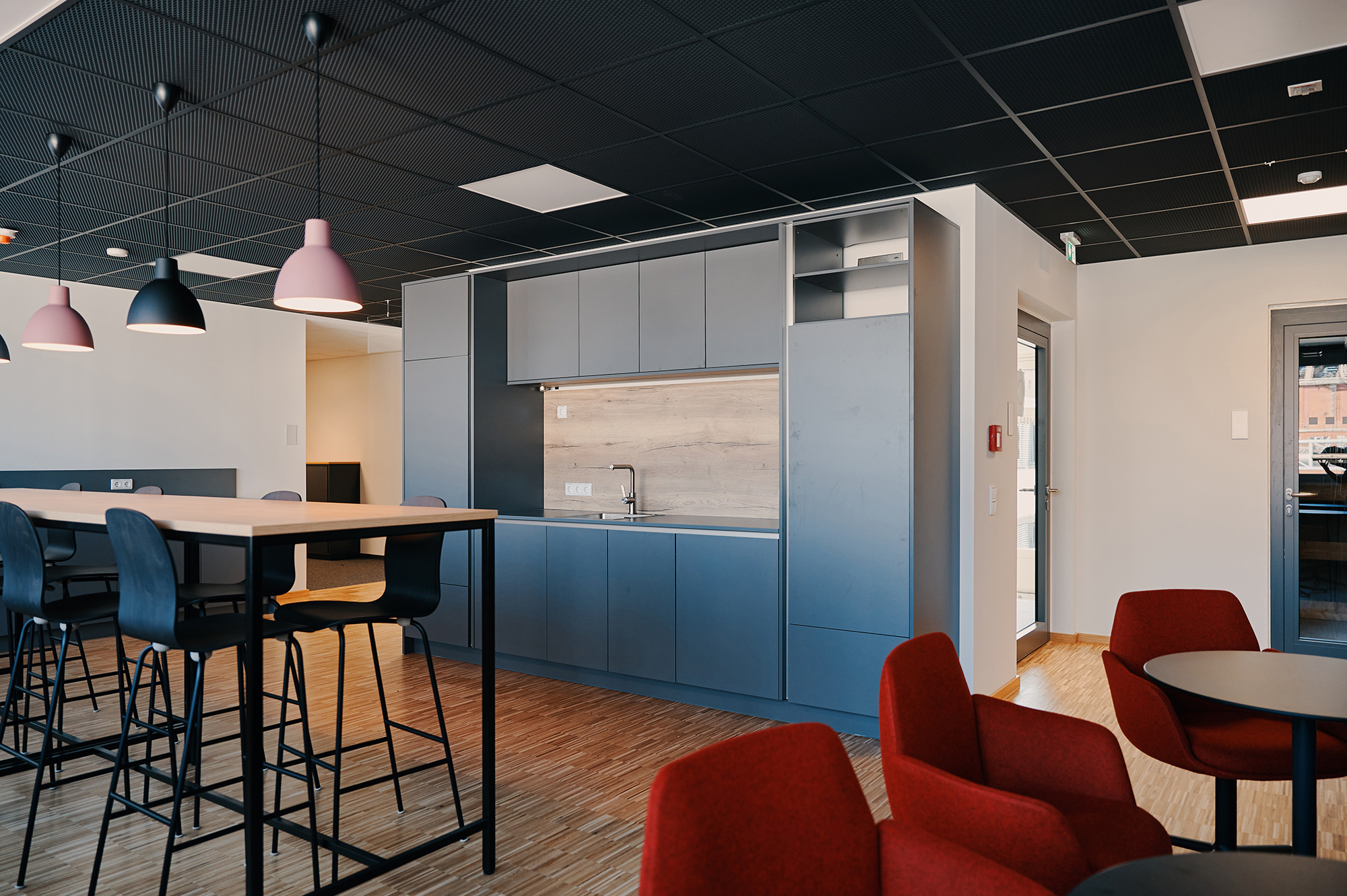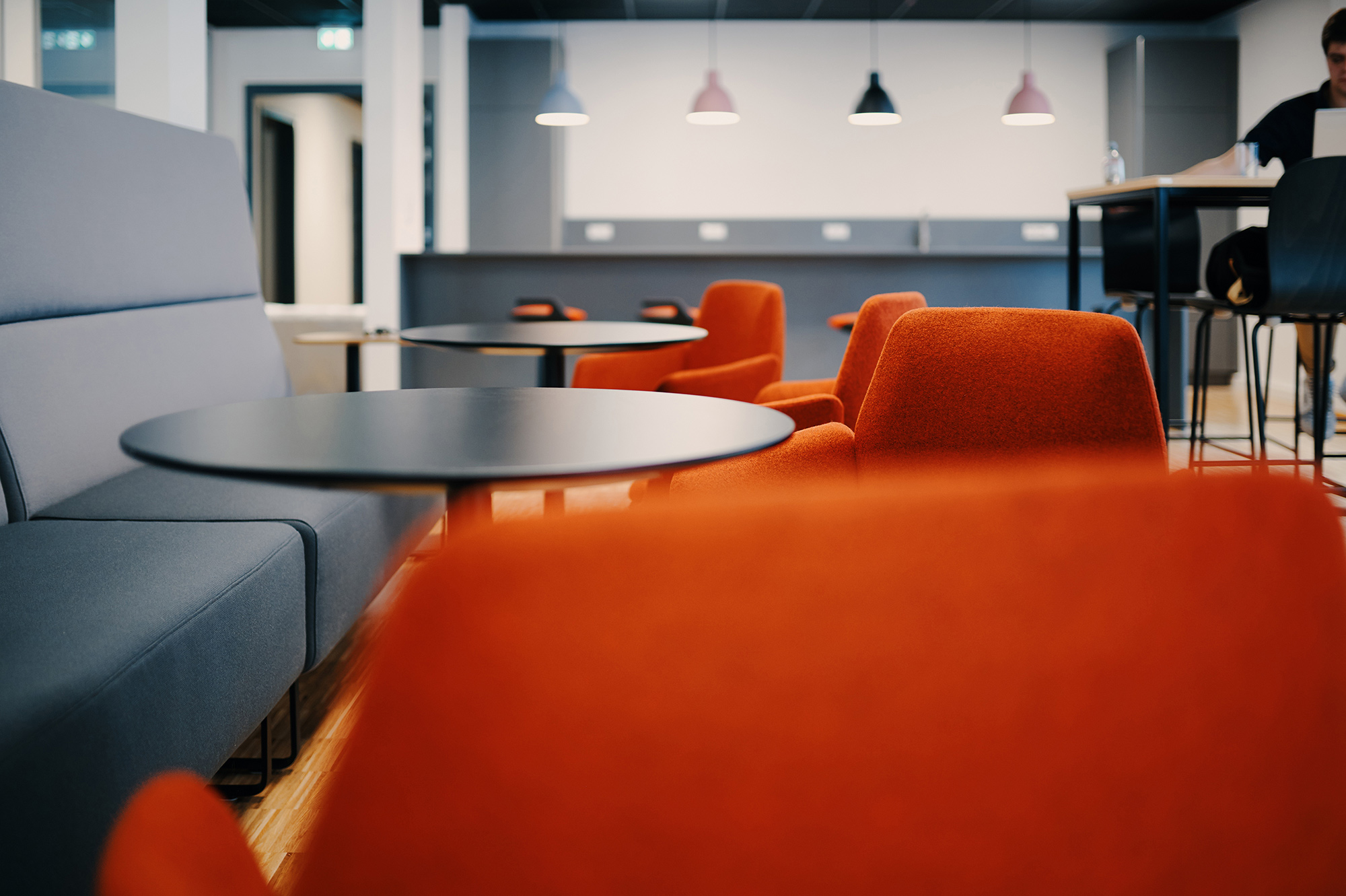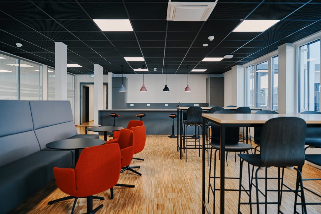 A color palette inspired by local natural and architectural landscapes, such as the baroque buildings of the Mannheim downtown core, create a neutral, warm, comfortable and homogeneous neighborhood environment. Black and anthracite metal is used as an accent for specific interior details in structural elements (e.g. ceiling) or on furniture to reflect the city’s industrial heritage. Combinations of soft textile fabrics such as light grey acoustic curtains and warm materials such as plywood, create a welcoming setting. Furniture shapes find inspiration in local pavements and curve lines, and are used to create a dynamic atmosphere of the communication spaces.