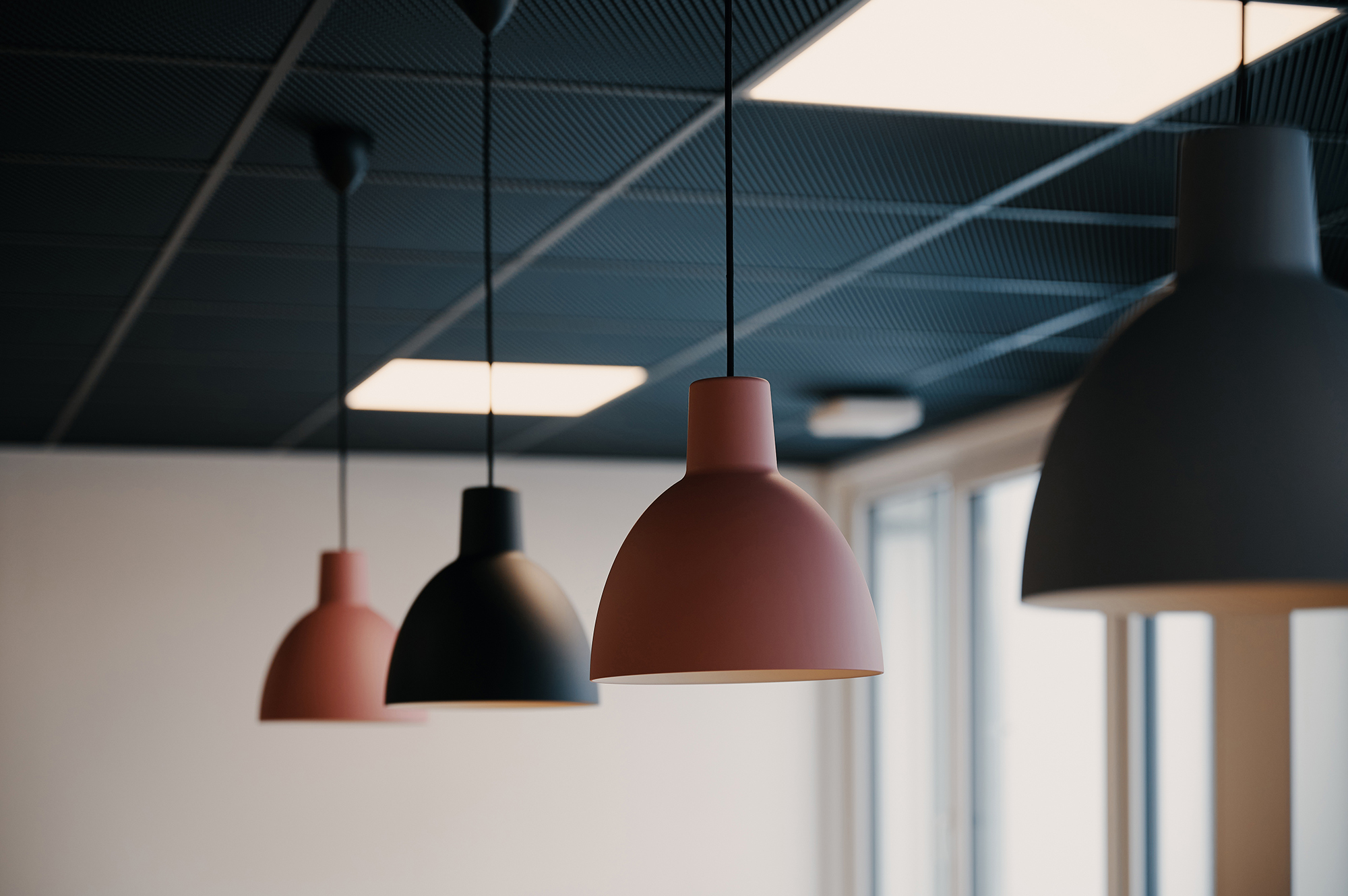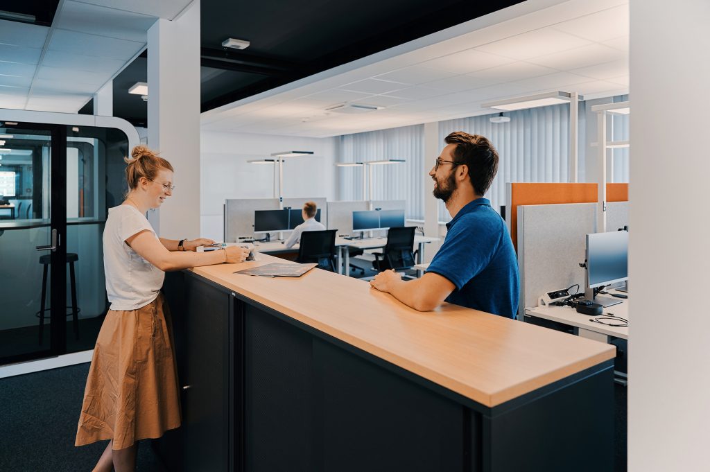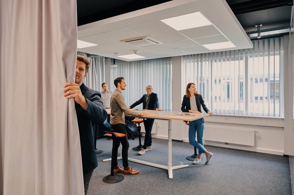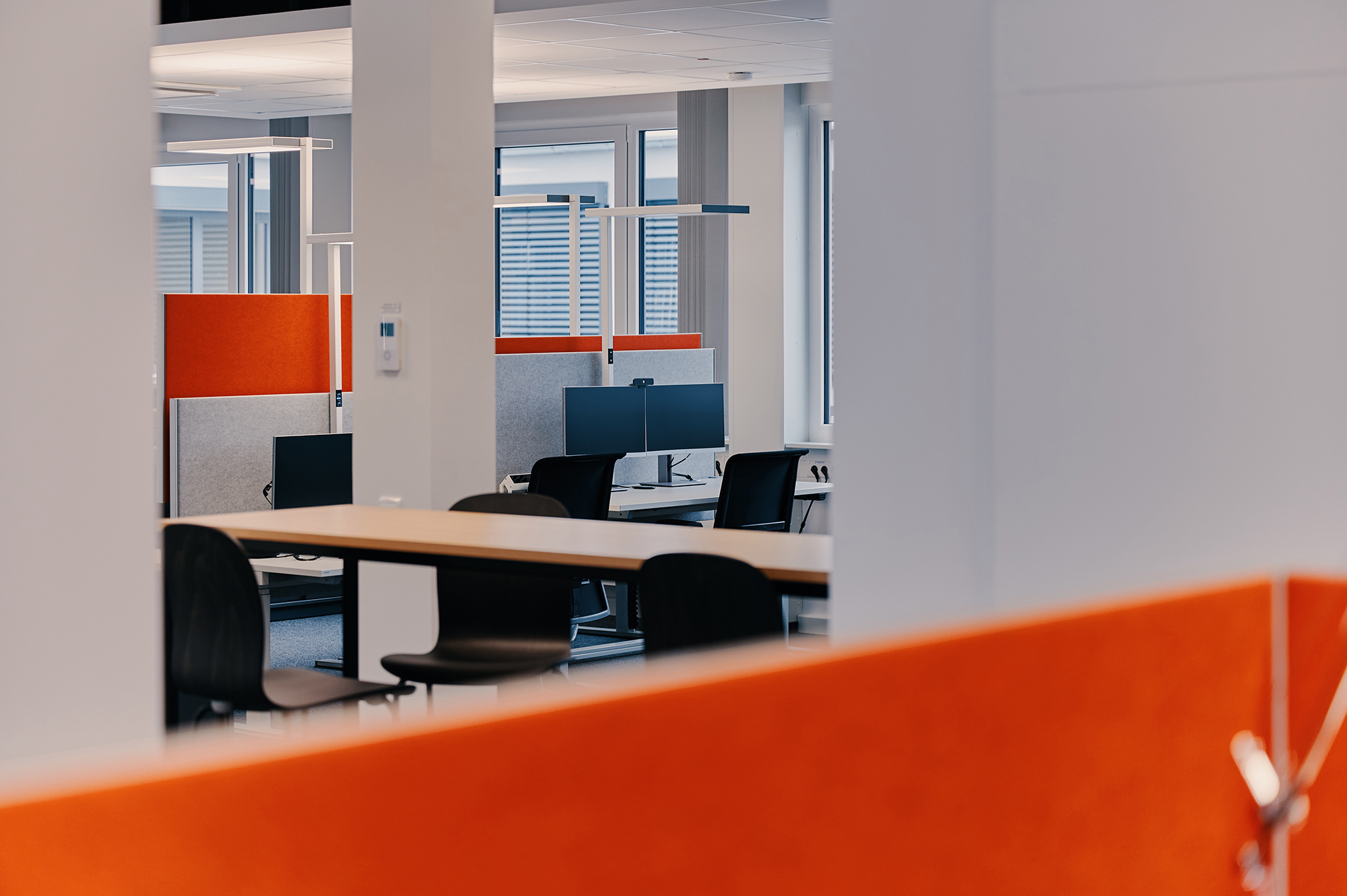 A color palette inspired by local natural and architectural landscapes, such as the baroque buildings of the Mannheim downtown core, create a neutral, warm, comfortable and homogeneous neighborhood environment. Black and anthracite metal is used as an accent for specific interior details in structural elements (e.g. ceiling) or on furniture to reflect the city’s industrial heritage. Combinations of soft textile fabrics such as light grey acoustic curtains and warm materials such as plywood, create a welcoming setting. Furniture shapes find inspiration in local pavements and curve lines, and are used to create a dynamic atmosphere of the communication spaces.