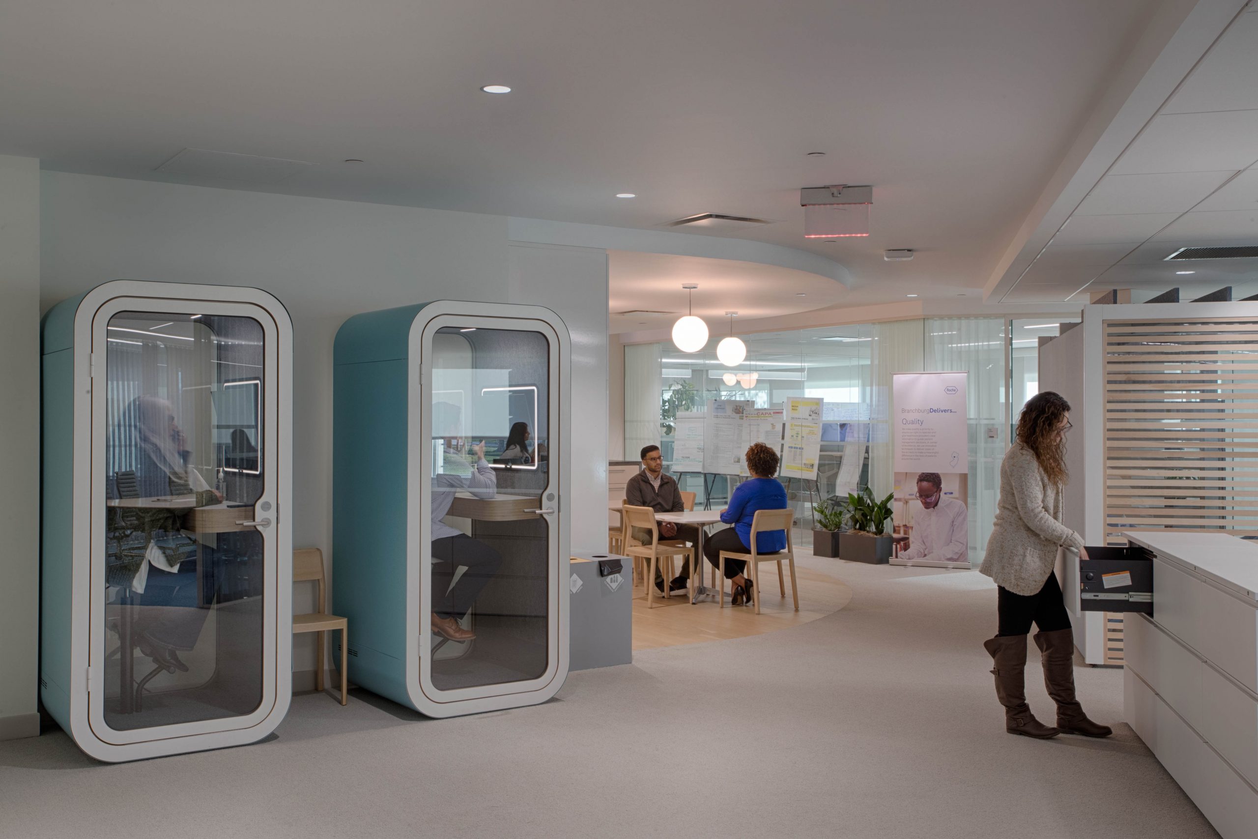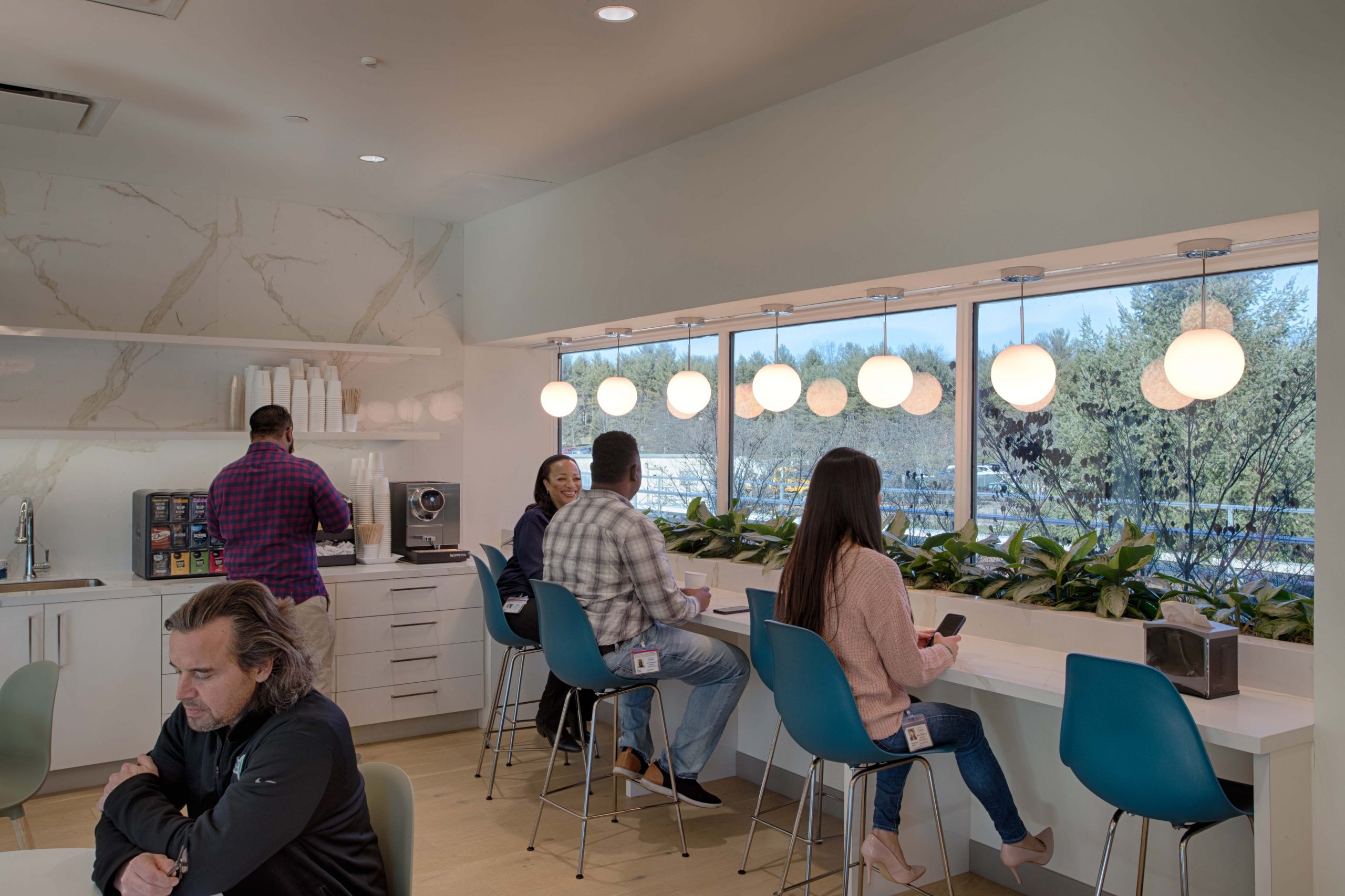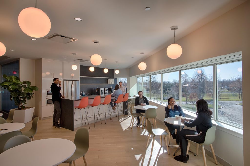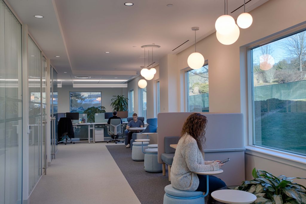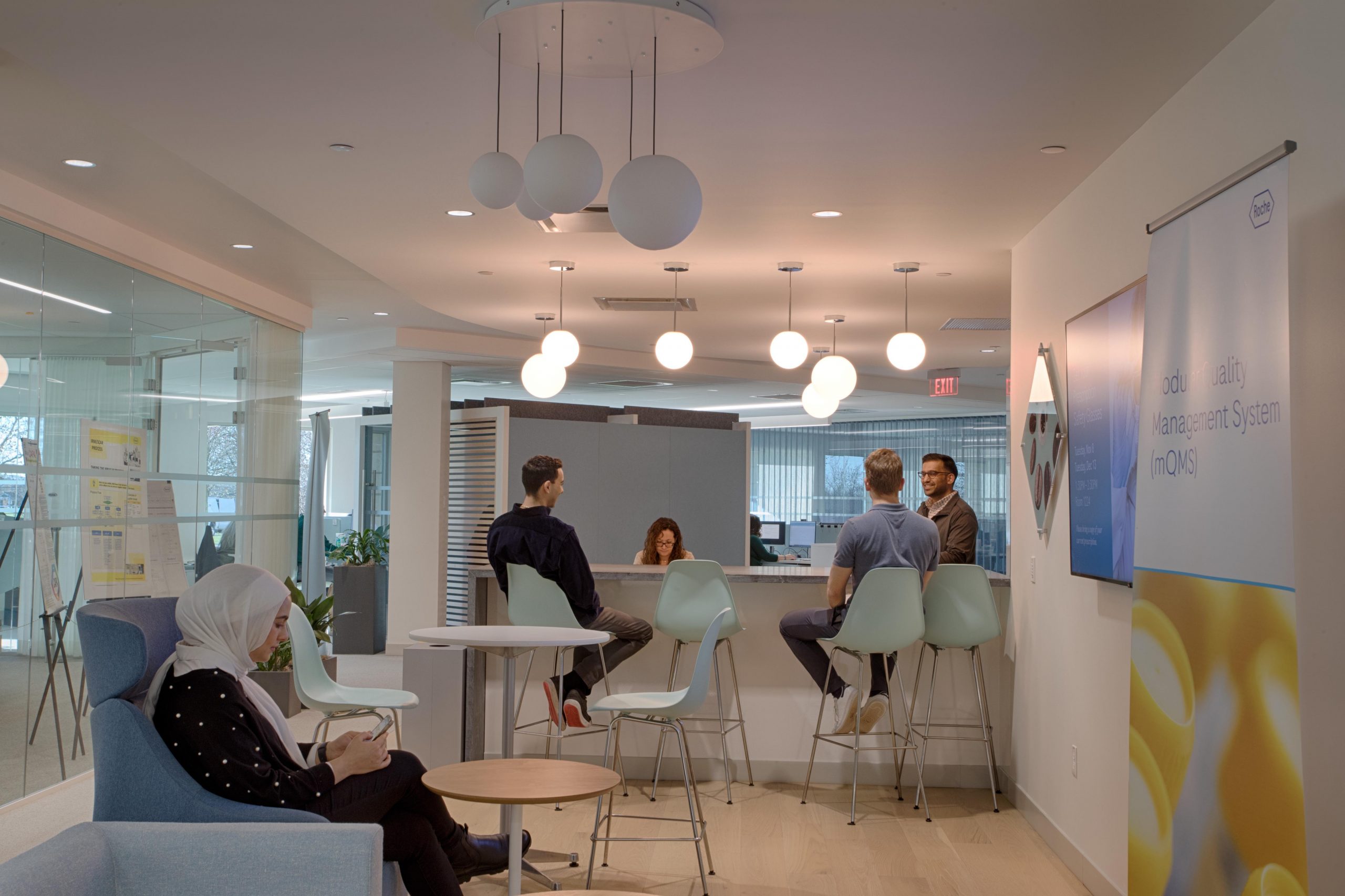 The Roche Molecular Systems, Inc. facility located in Branchburg, N.J. originally built in 1987, has served the company and employees well for several decades. It became abundantly clear however that the style and philosophy of the original interior office space had become outdated and needed a major redesign. The traditional perimeter executive offices with the window views were eliminated in favor of access to windows and natural daylight for all. There are numerous studies that highlight the benefit of daylight in the workplace as a physiological stimulant for our visual system and our circadian rhythm. The connection to the exterior is very important when designing interior office space and this philosophy guided our design.