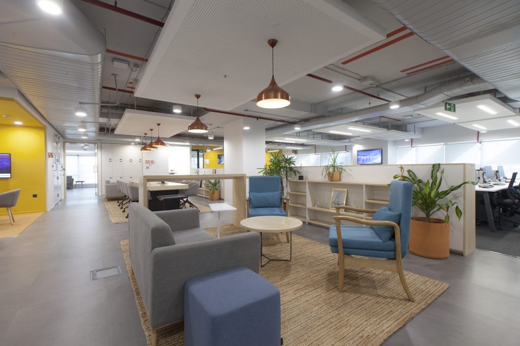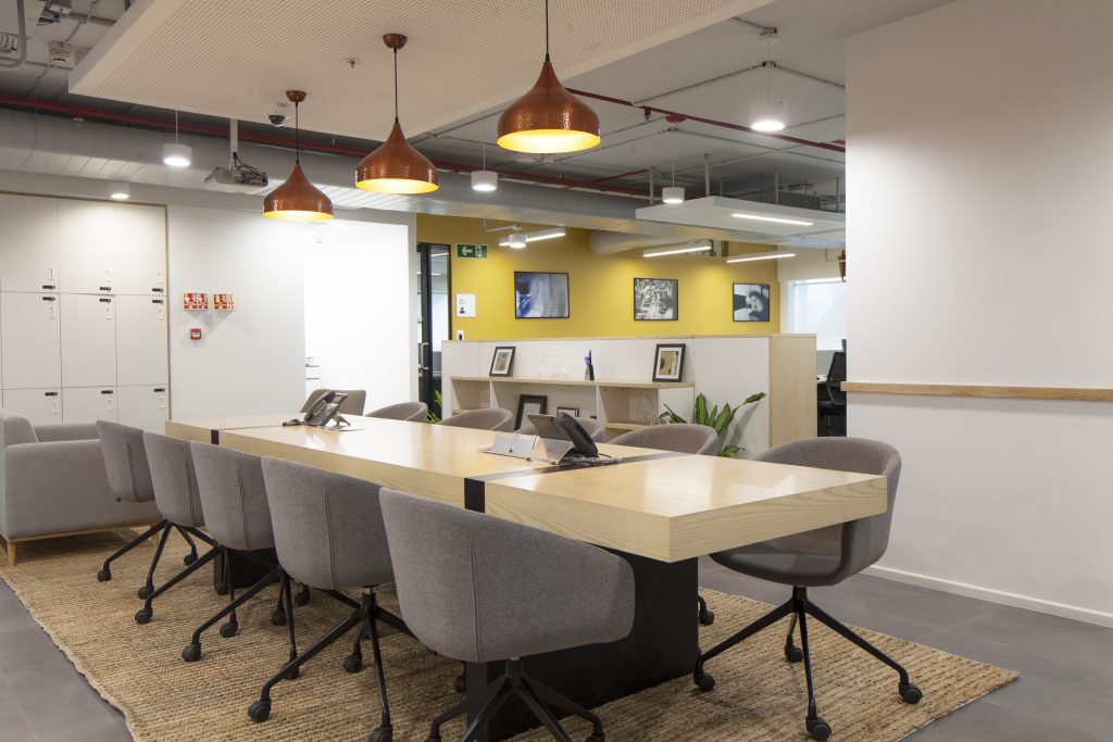 The open work area profits from natural light, allocating non-assigned desks as well as managers’ workstations, and features opportunities for team work display. A call center for 12 people, a cafeteria for social encounters that can also be used for work, and support spaces, complete the architectural program.