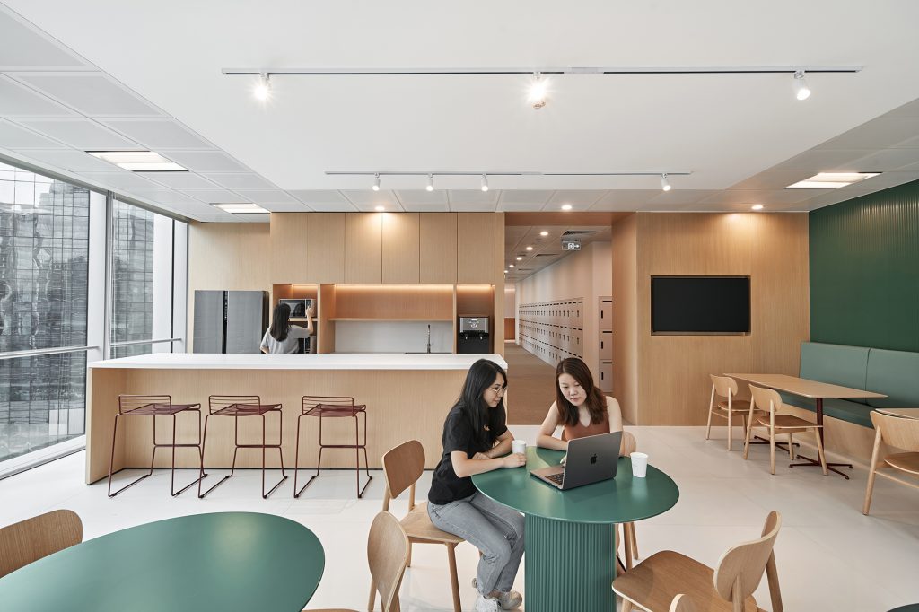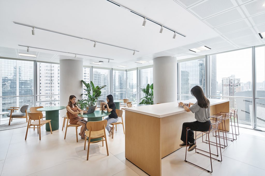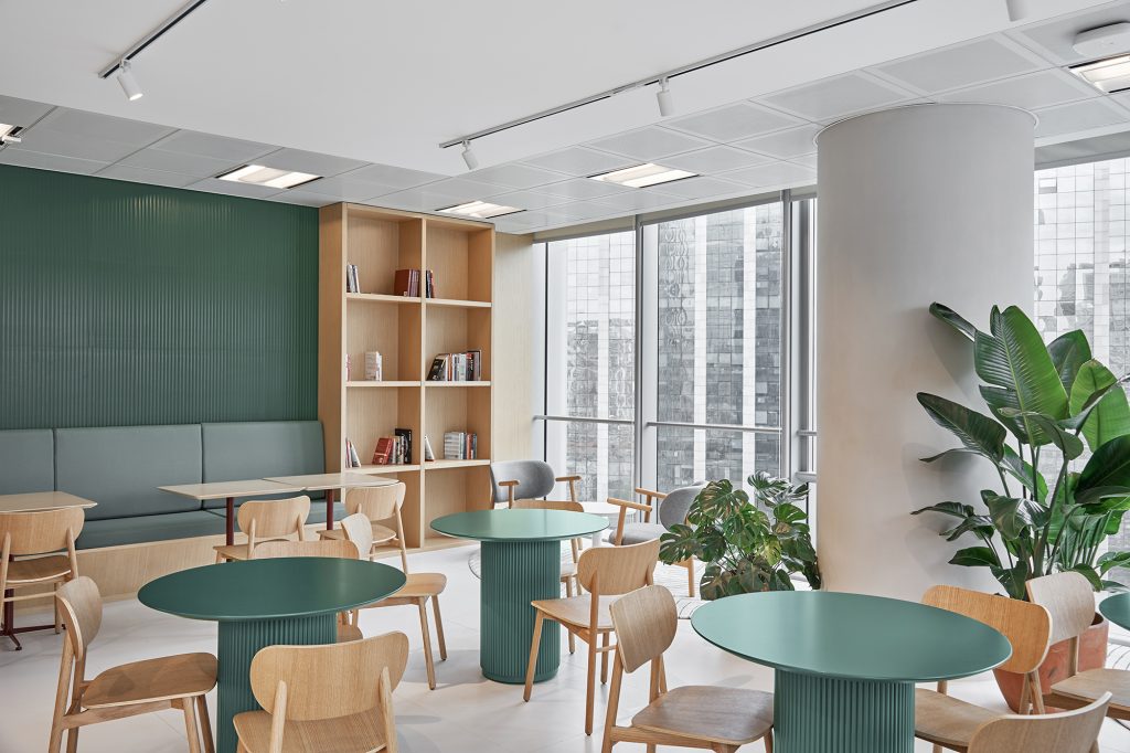 The design of the project was performed using a two-sage execution model with a Concept Designer and a local Design & Build Contractor. The result is a dynamic environment closely aligned with Roche global guidelines Our Spaces and China-specific design guidelines, while reflecting the needs and expectations of the local user team. The design concept integrates the character and color palette relevant to Guangzhou and focuses on the ideas of community and relationship with nature. Following the approach chosen by the user team, the workplace has a defined visitor-facing zone and a more private workspace. The office provides a range of formal and informal collaboration areas, a variety of workplace settings, and a Work Cafe to support additional meetings and social activities. Natural materials, greenery, and biophilic elements permeate the space, creating a warm and comfortable atmosphere inviting to employees and visitors alike.