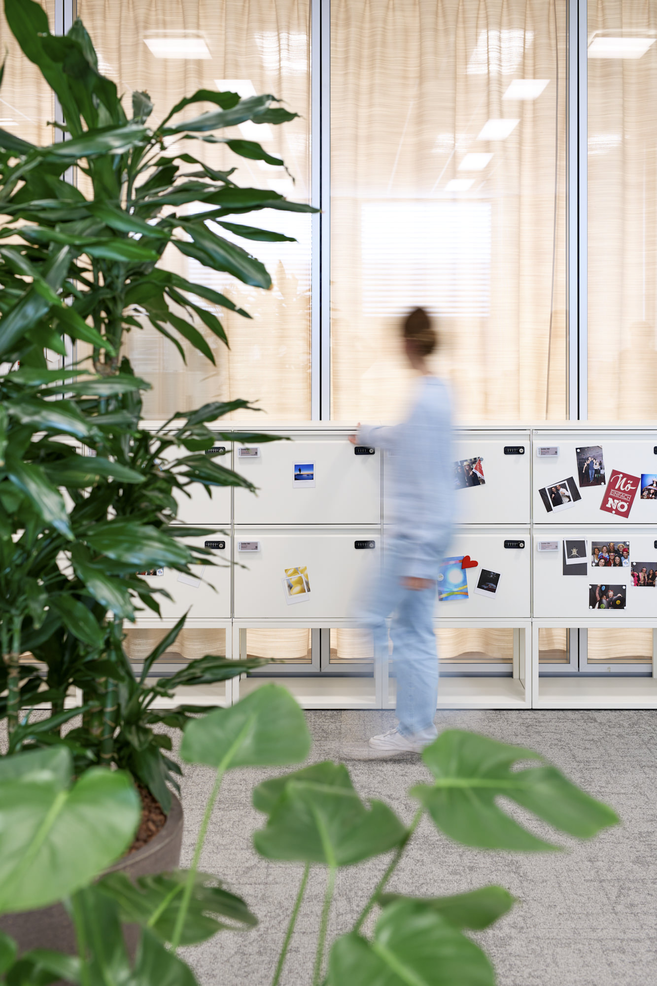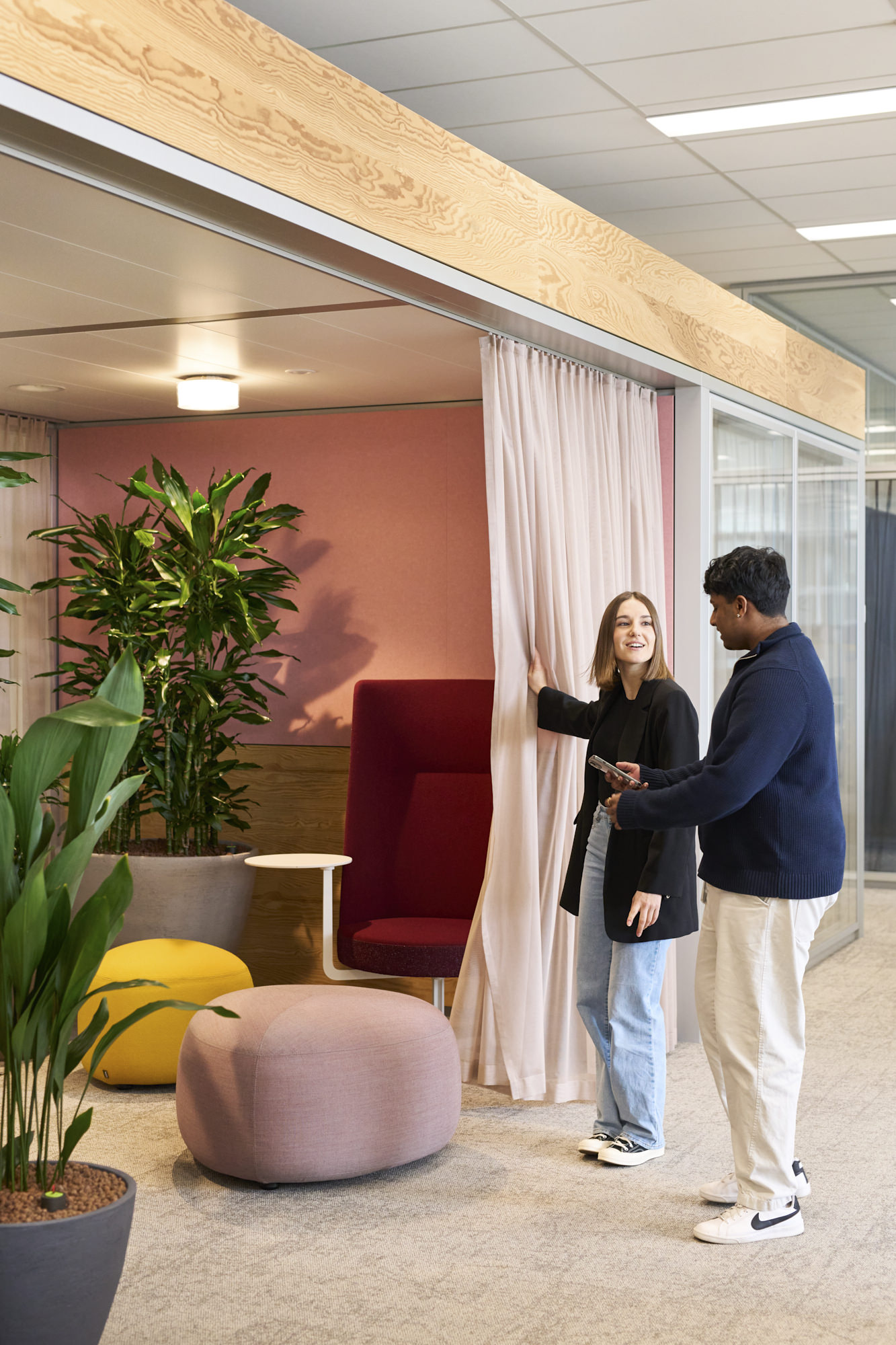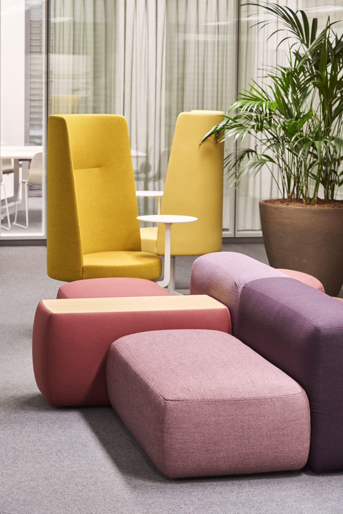 One of the guiding design principles from the Strategic Master Plan Rotkreuz is the ‘interlace of contrasts’. This placemaking concept builds on the notable contrasts of the typical pure and cubic Roche architecture with the natural, lush surrounding landscape. Now, also in the buildings, this design principle delivers a new contrast between the functional, minimal Roche corporate architecture vocabulary and the Swiss conviviality with warmth and textures in the interior workspaces. Natural materials and greenery, and an individual colour palette for each building based on diverse local landscape characteristics (for example a summer alpine meadow or a valley in autumn) contribute to create different atmospheres per building.