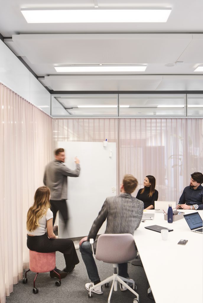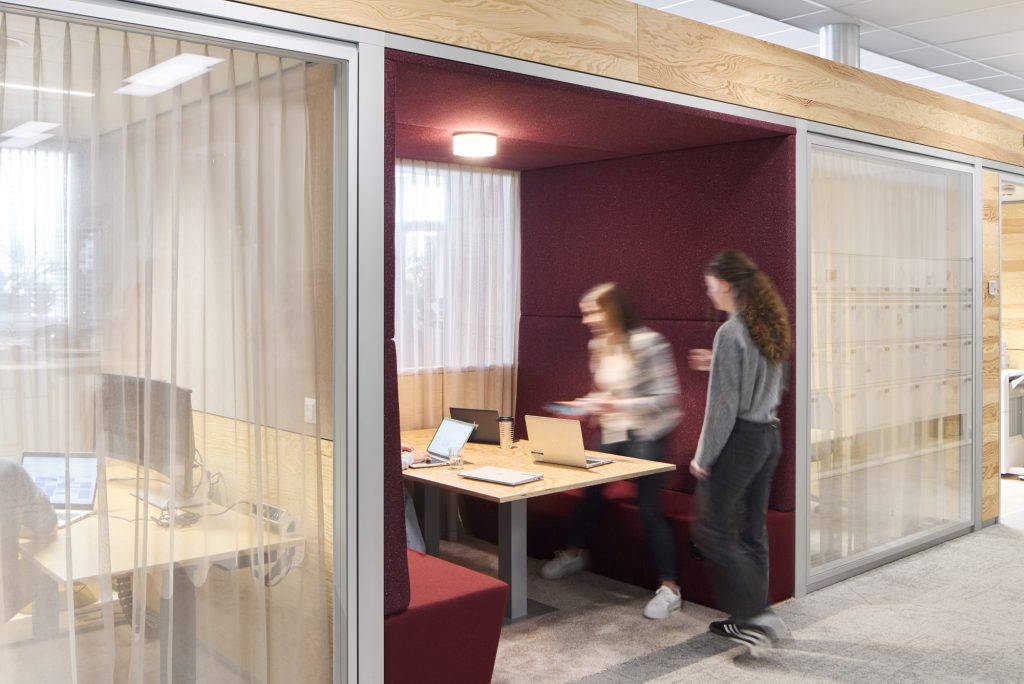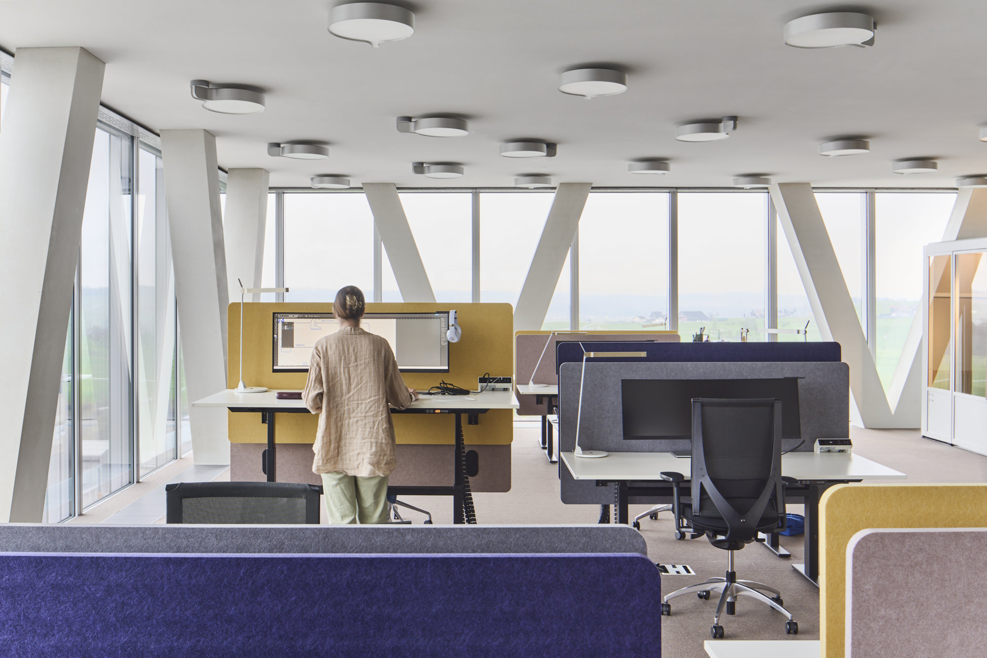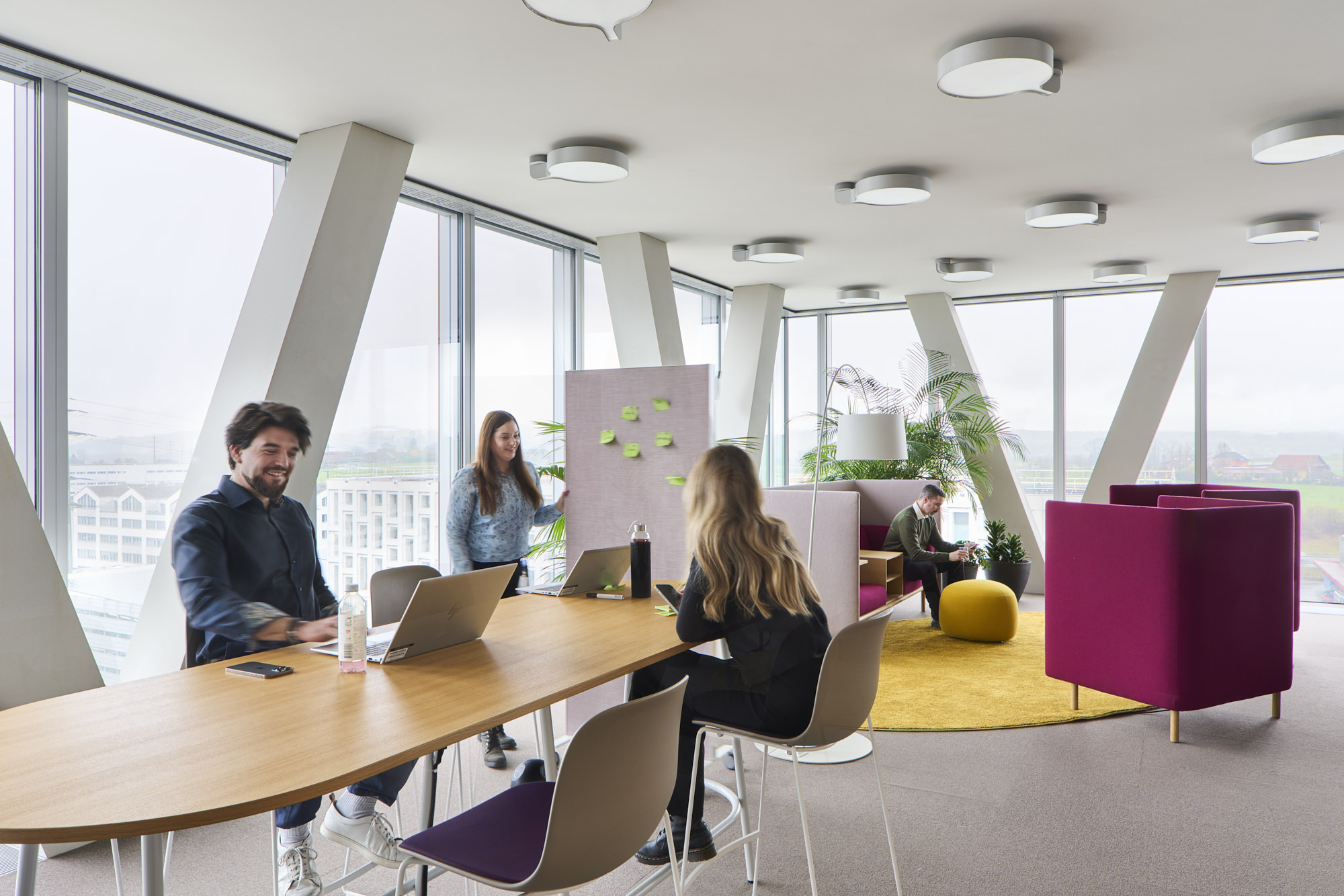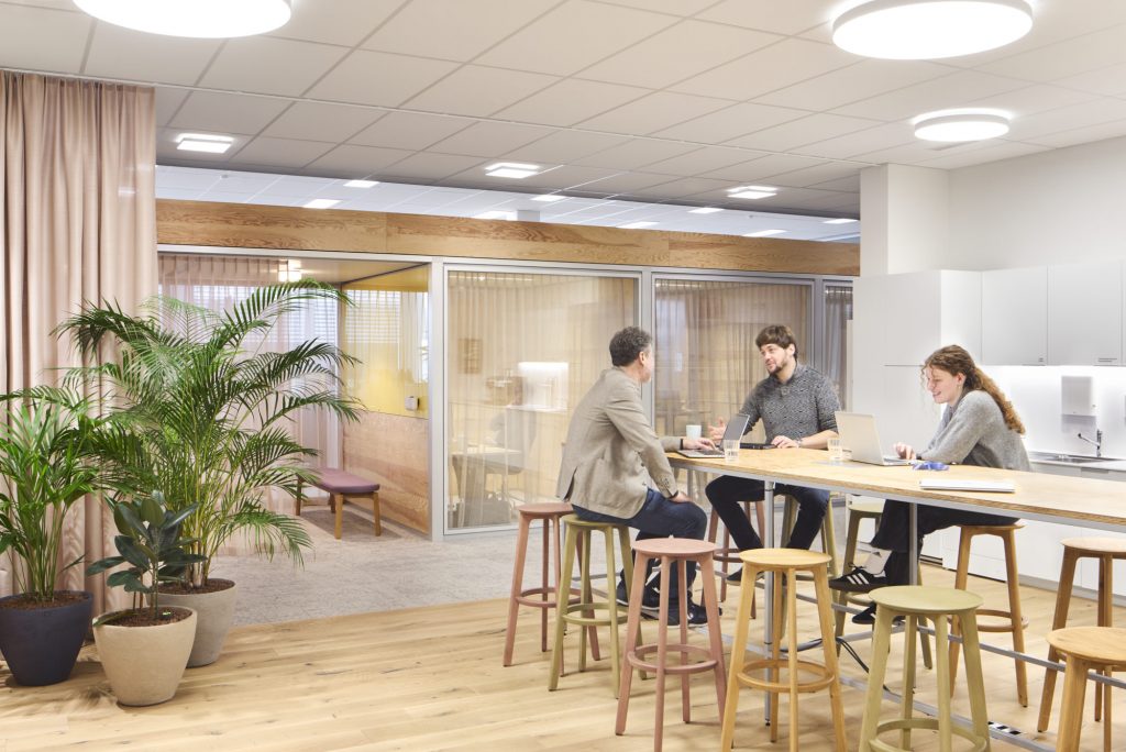 WorkSmartRDI has merged the different activities of the employees with the existing functions and architecture of the building. The strategic decision, to only carry out coarser interventions if necessary, underscores the sustainable approach for the refurbishment. Next to a range of work settings for individual and focussed work, there are areas created for collaborative work, informal meetings and creative processes. These areas are equipped with flexible furnishings and comfortable lounge furniture and are located to benefit most from the beautiful views outside.