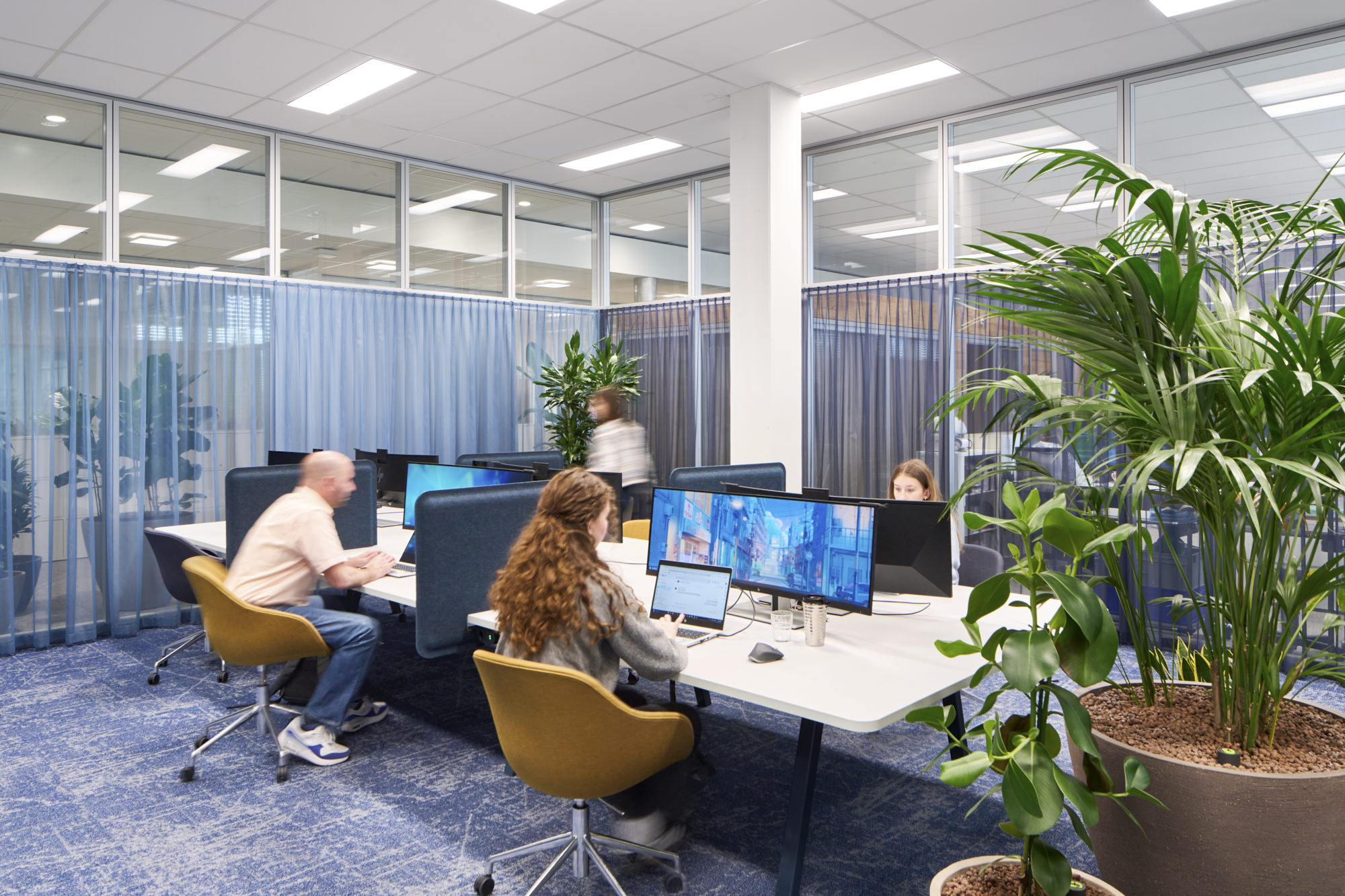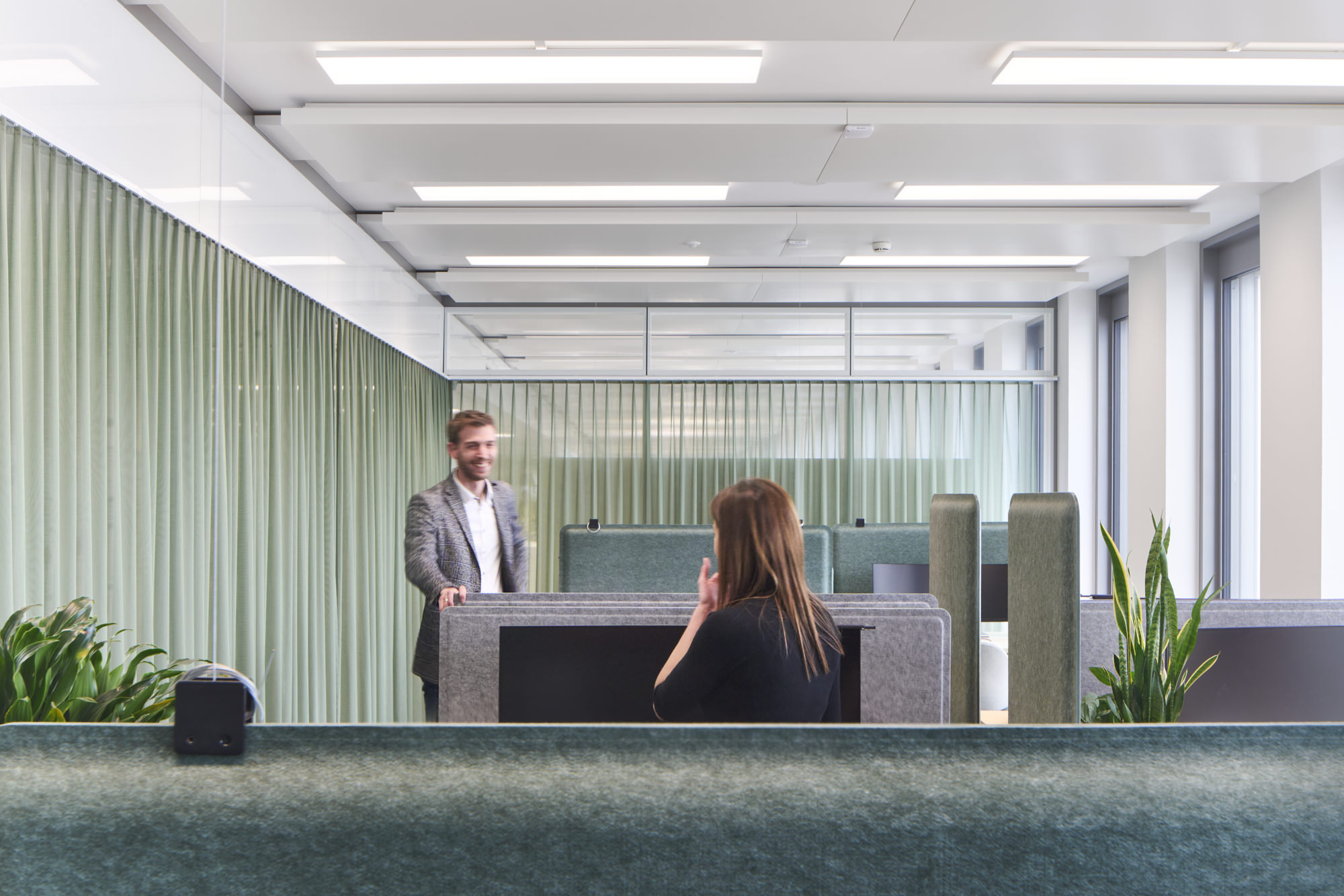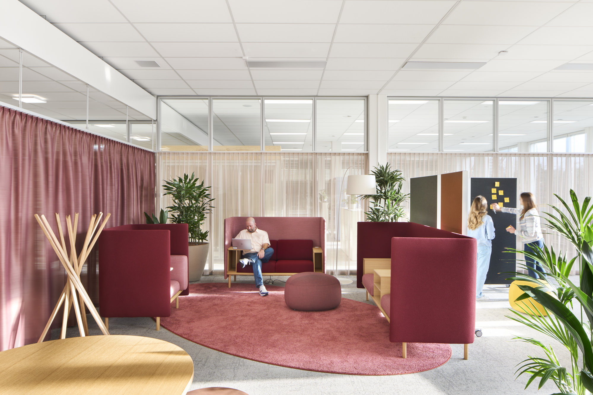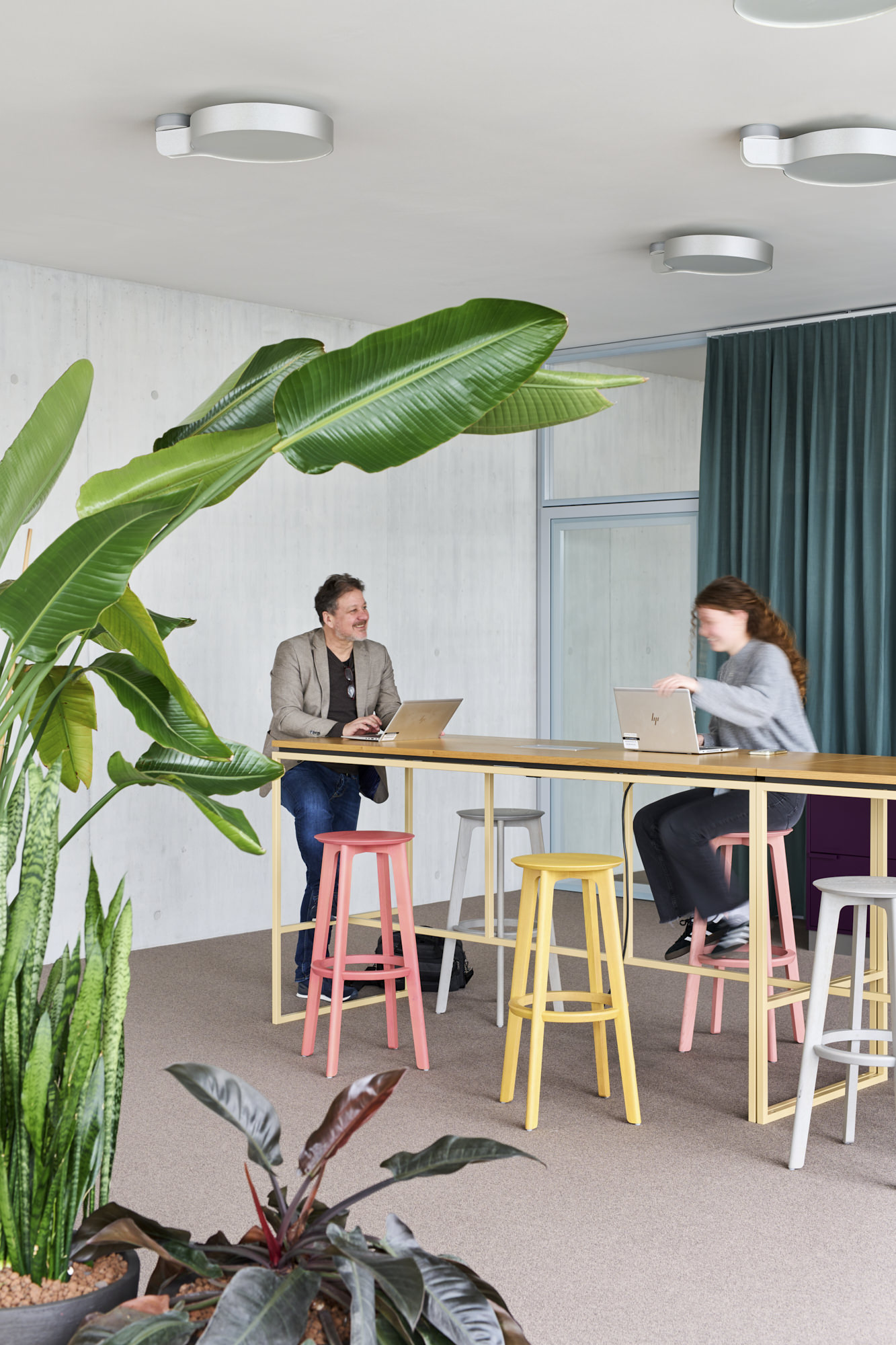 WorkSmartRDI has merged the different activities of the employees with the existing functions and architecture of the building. The strategic decision, to only carry out coarser interventions if necessary, underscores the sustainable approach for the refurbishment. Next to a range of work settings for individual and focussed work, there are areas created for collaborative work, informal meetings and creative processes. These areas are equipped with flexible furnishings and comfortable lounge furniture and are located to benefit most from the beautiful views outside.