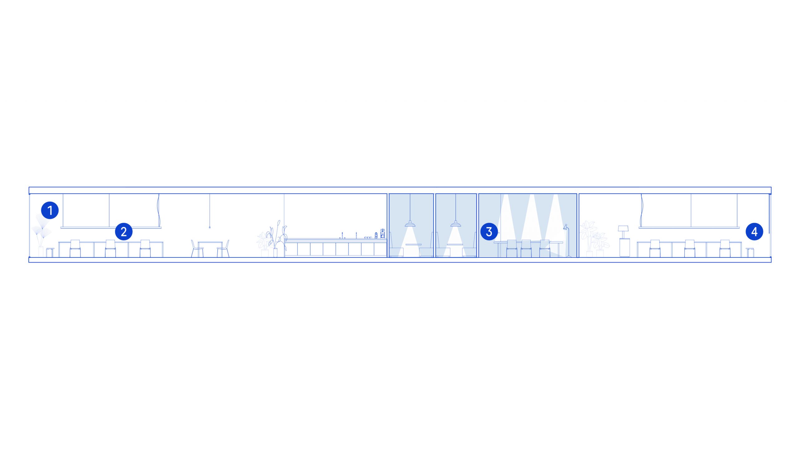 Use transparent partitions and translucid elements close to windows to bring natural light into the building as deeply as possible.