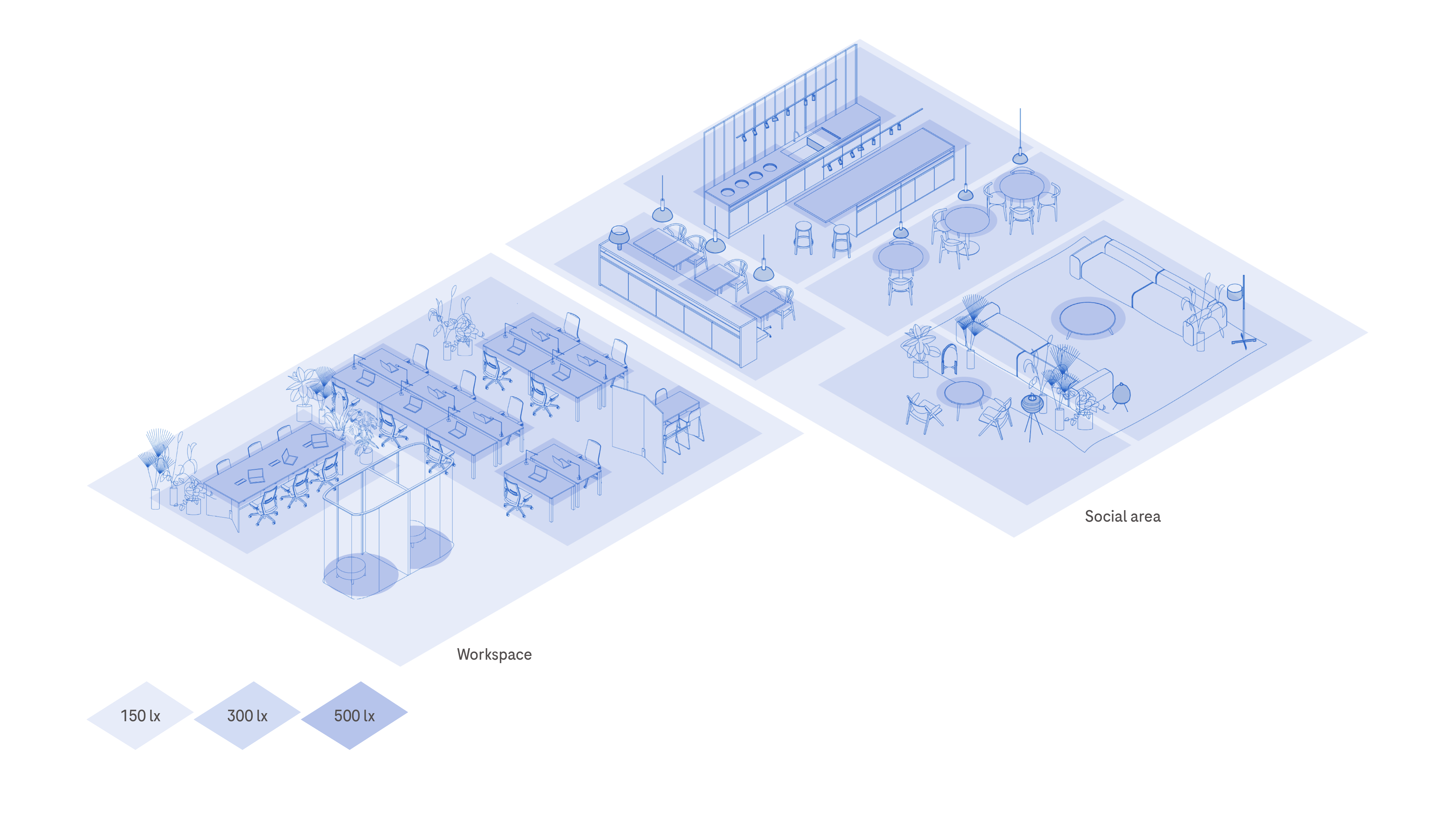 • Recommended light levels are determined according to the room size and intended activities within the space. Contrasts in the light level can be introduced for wayfinding and enhanced atmosphere.