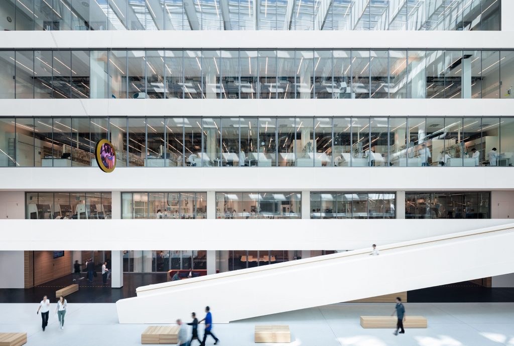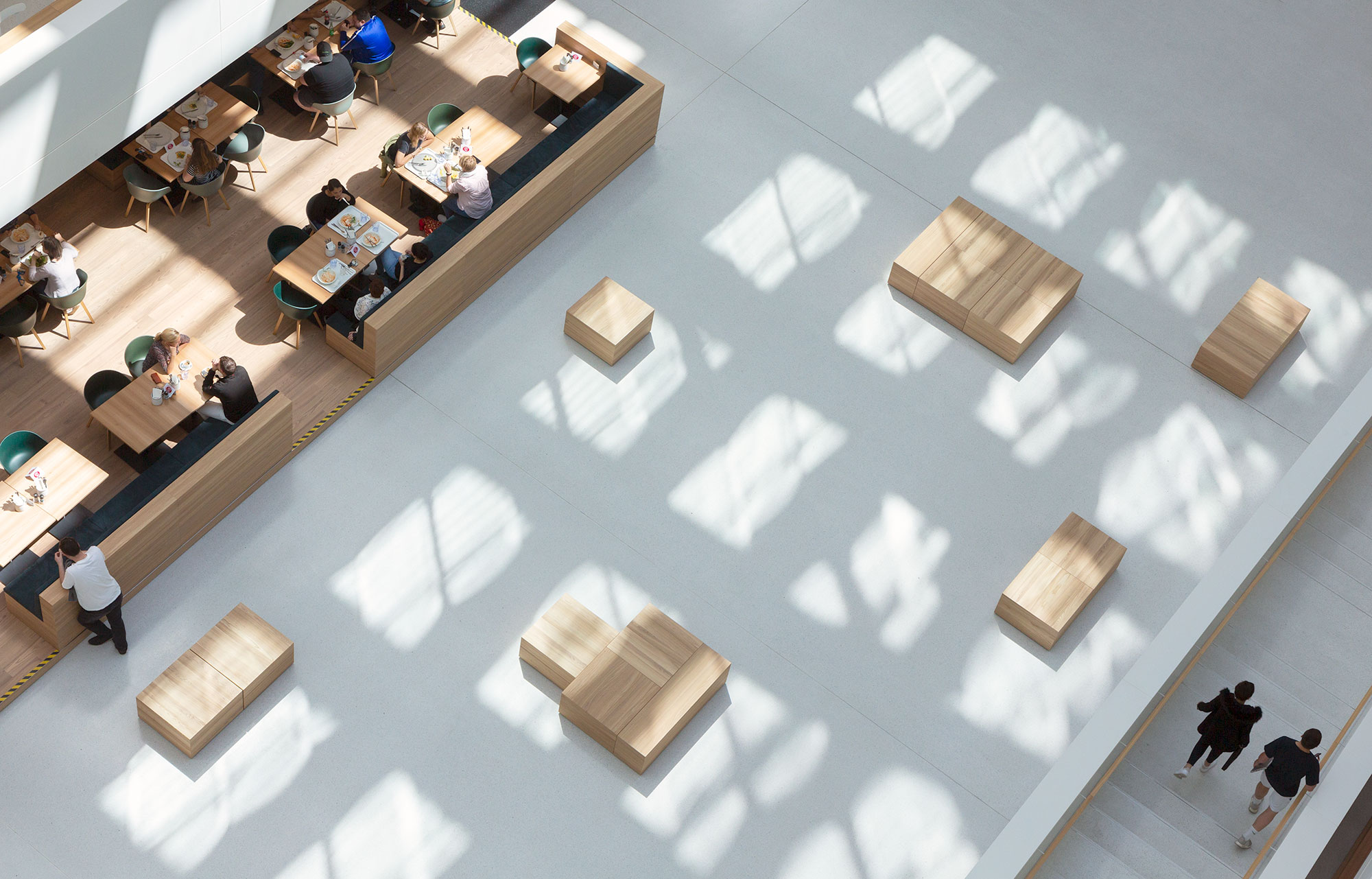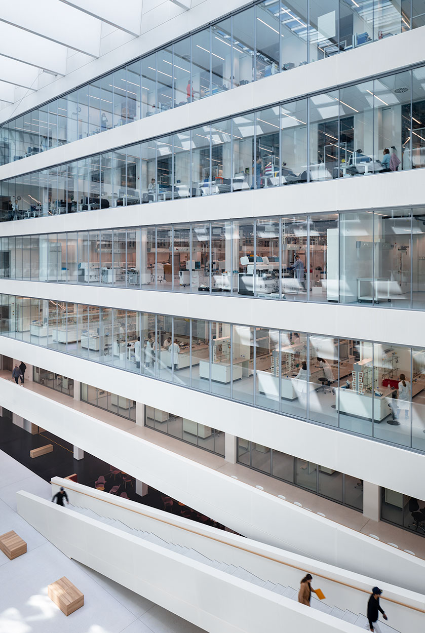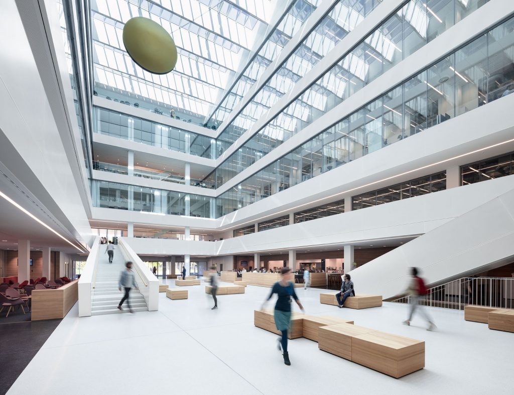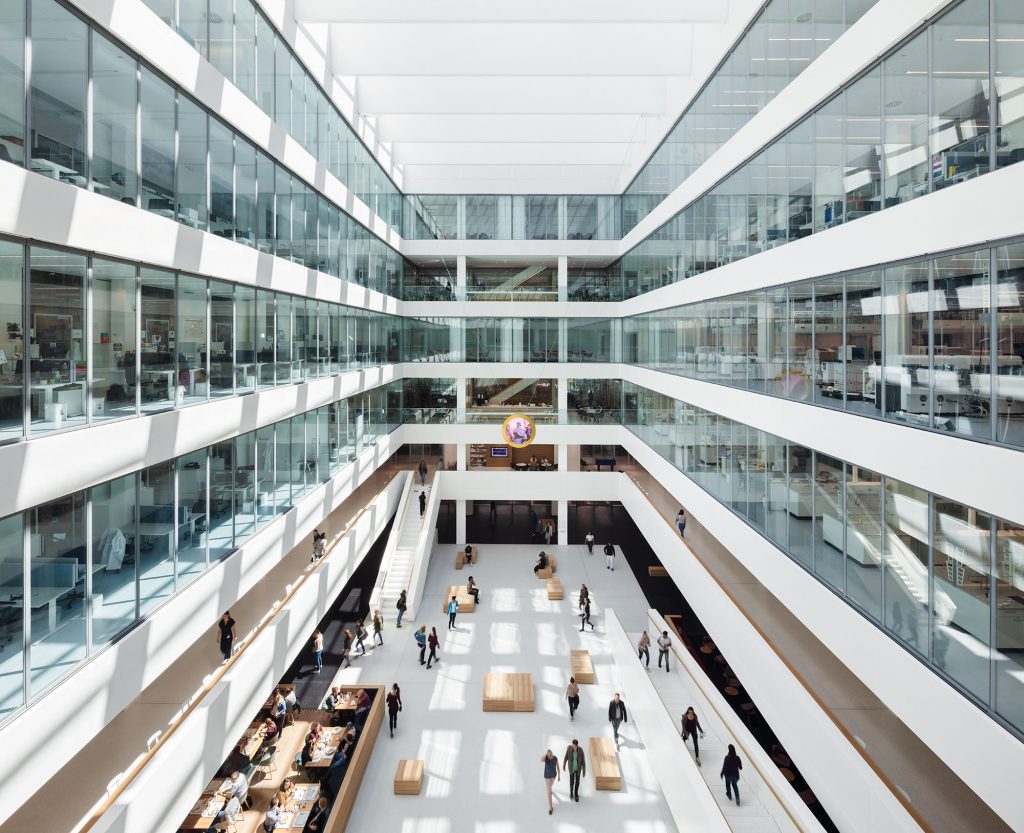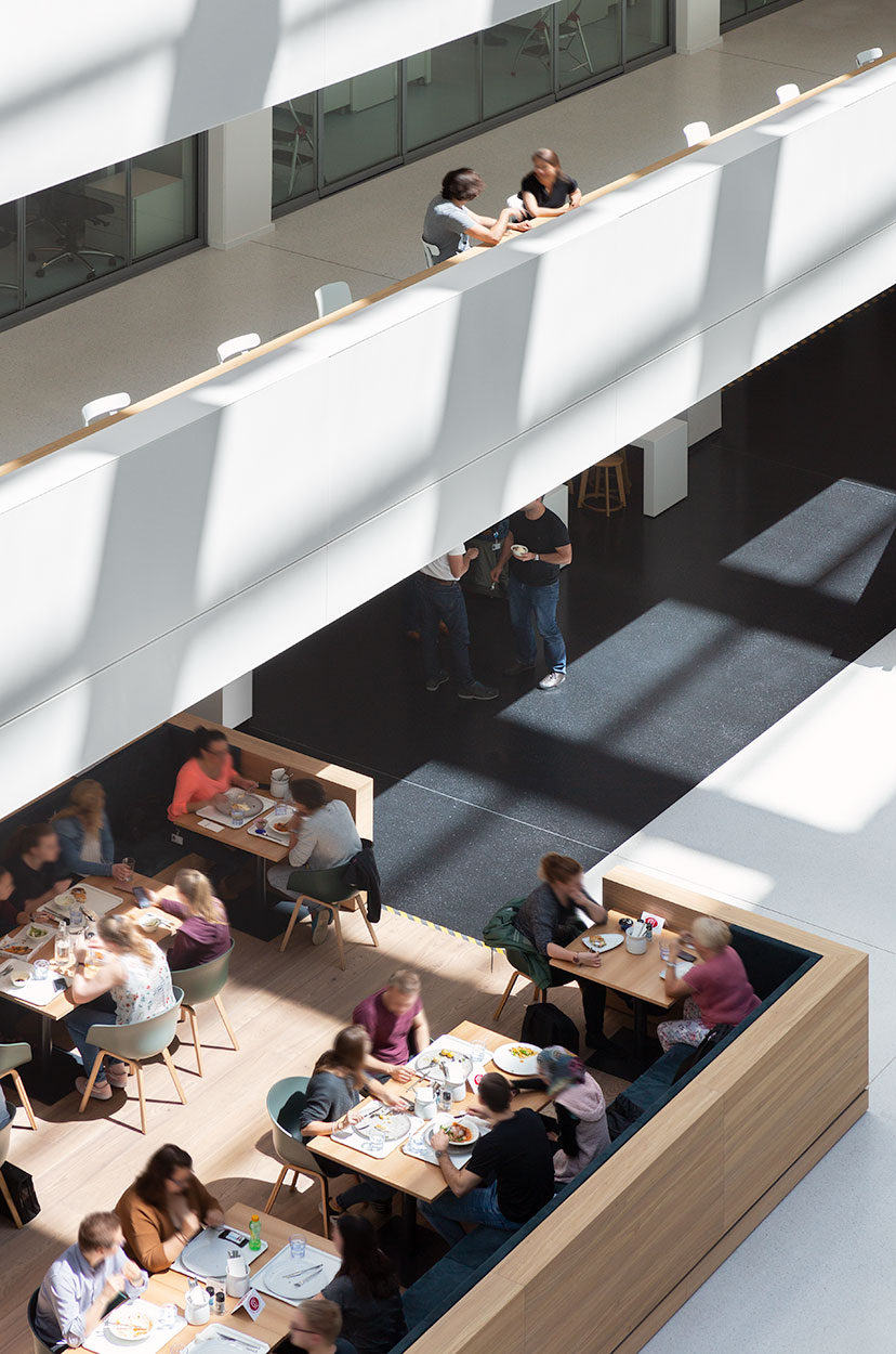 The six storeys of the 37,900 sqm building complex is structured around a central atrium that connects the individual floors and divisions. The light and bright covered space extends right up to the roof and directs daylight into the rooms. The ground floor, which is directly connected to the bistro and the conference area, provides a zone for interaction and communication that can also be used for events.