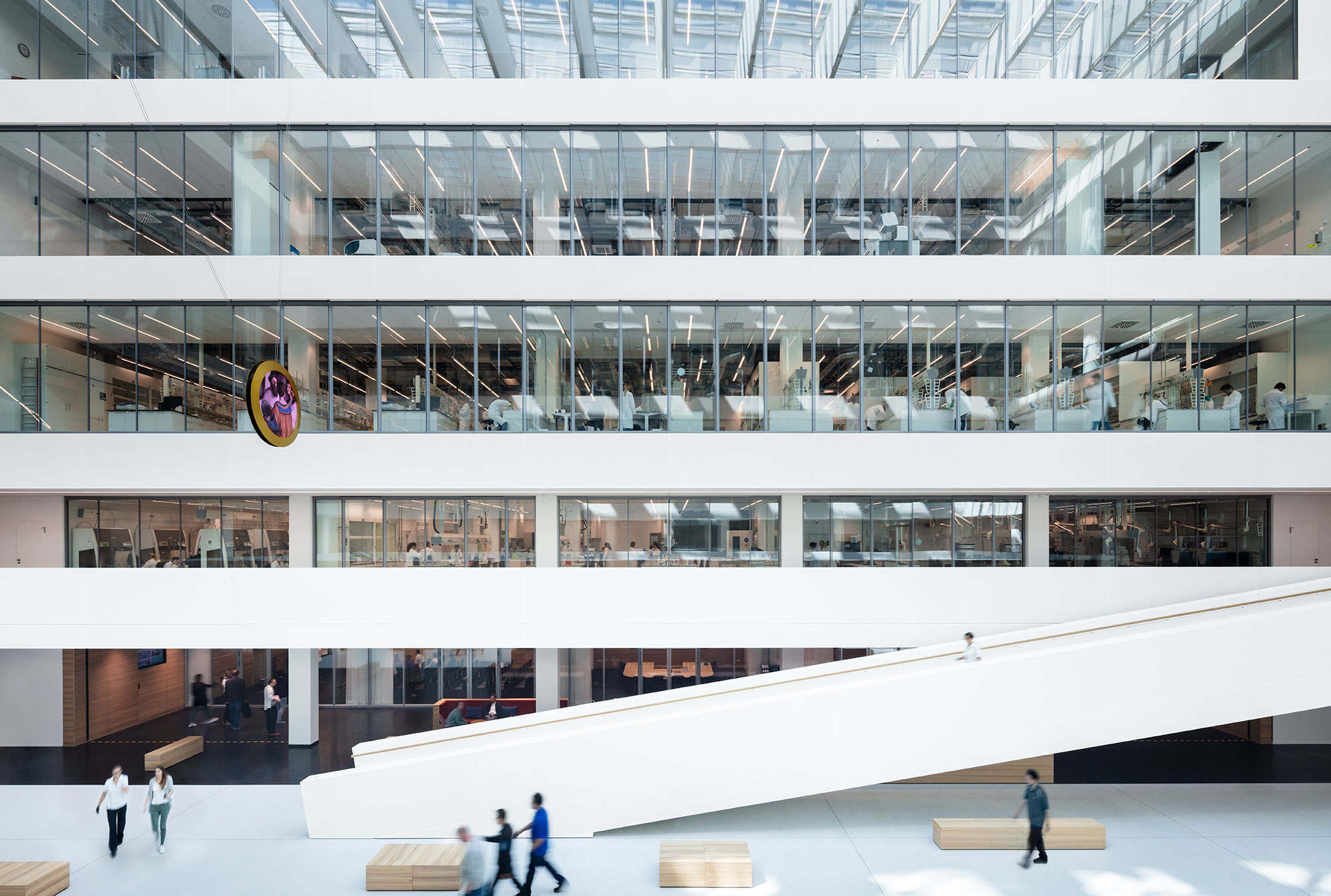 While the first floor is reserved for the training centre, the upper four storeys are earmarked for laboratory and office use. They are distributed around the central atrium with two building wings on each floor and are flanked by lifts adjacent to the circulation zones. The laboratories connect in the west and east with smart offices and open plan office spaces. The modular design of the compact reinforced concrete construction is based on strict layout grids, ensuring the greatest possible flexibility. The façade of the publicly accessible ground floor is completely glazed. The building envelope is horizontally divided in the upper storeys in accordance with the guidelines provided by Roche. Continuous prefabricated window balustrades divide the exterior appearance into horizontal bands. The window height decreases as the balustrades on the upper floors increase in height.