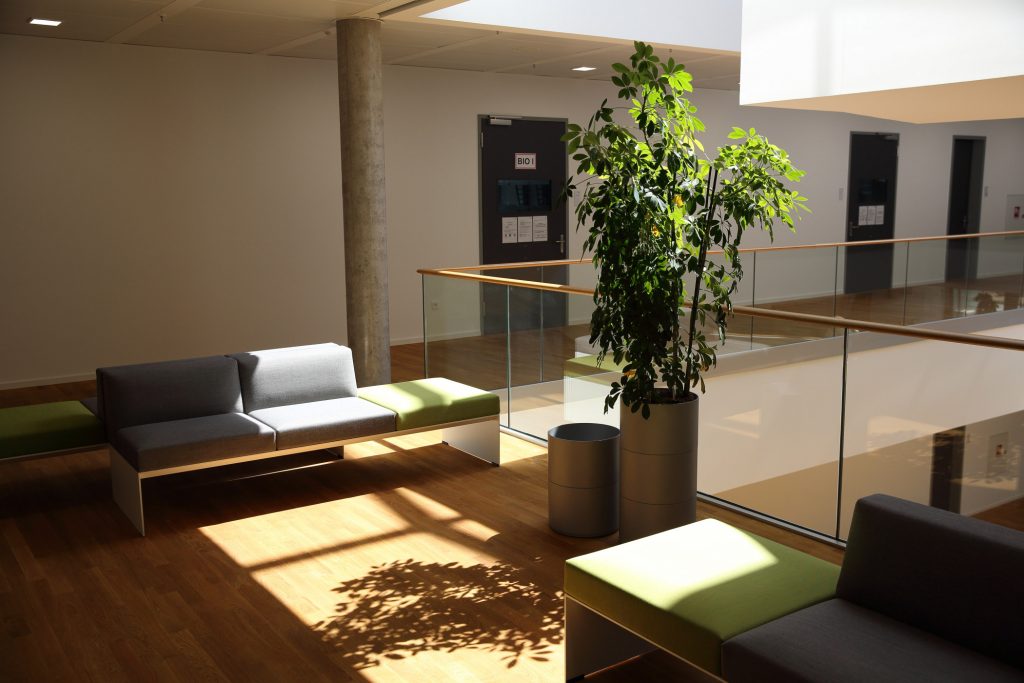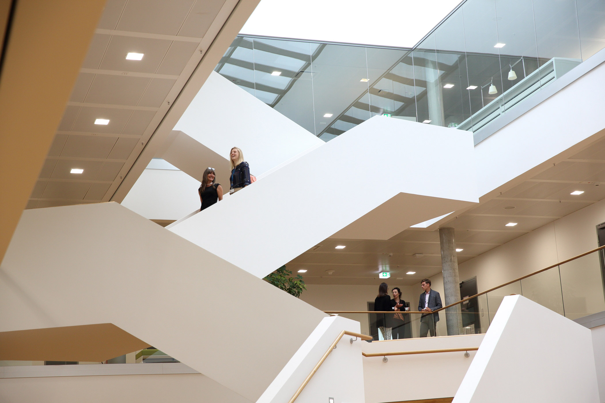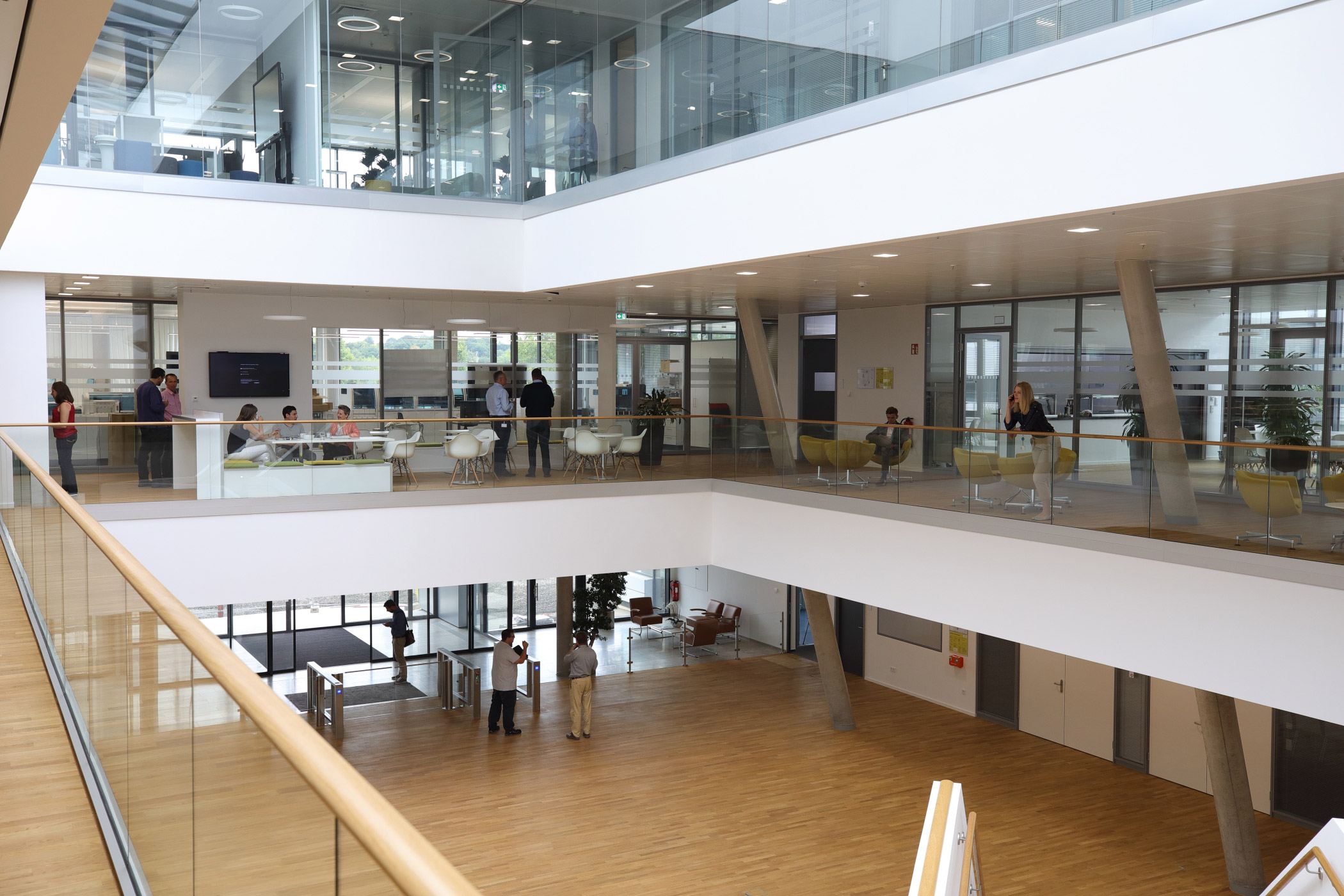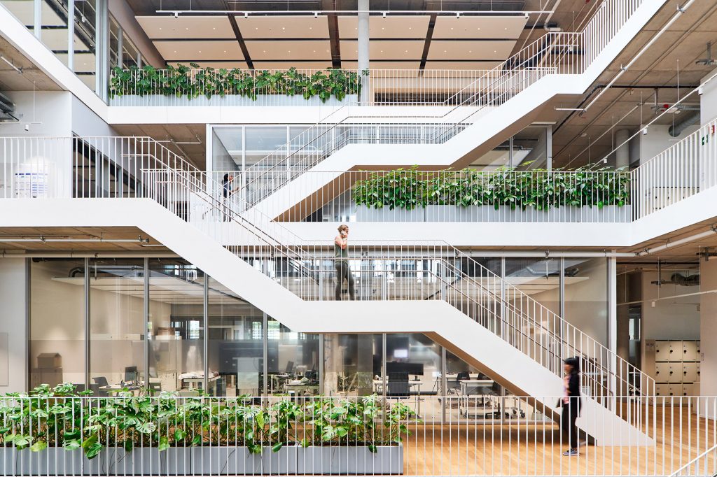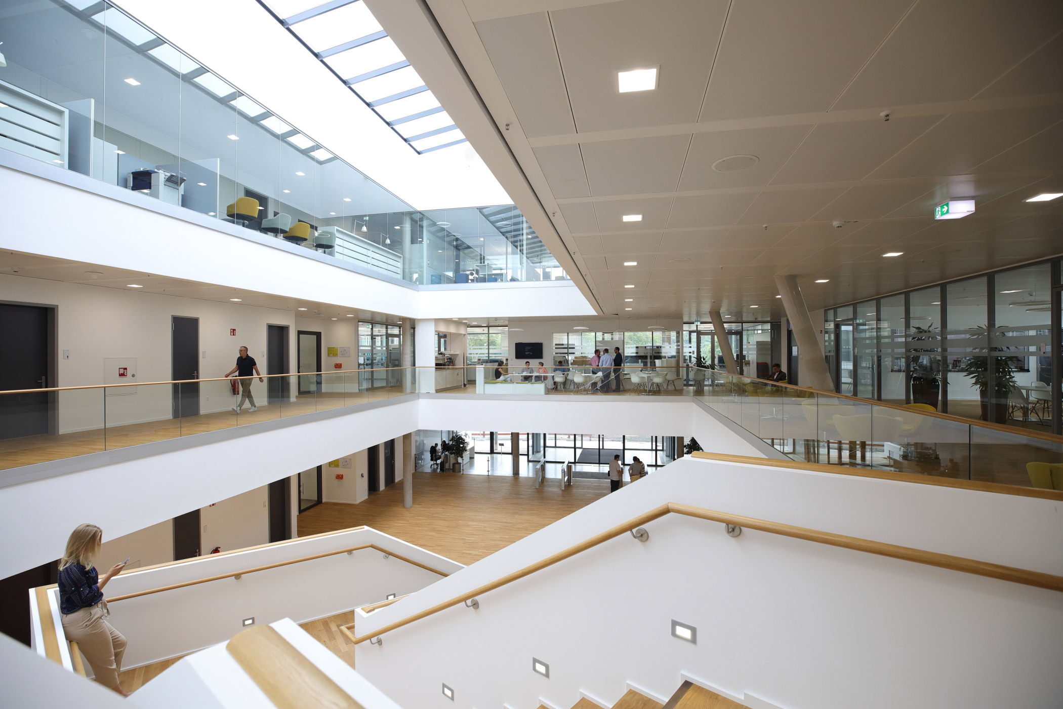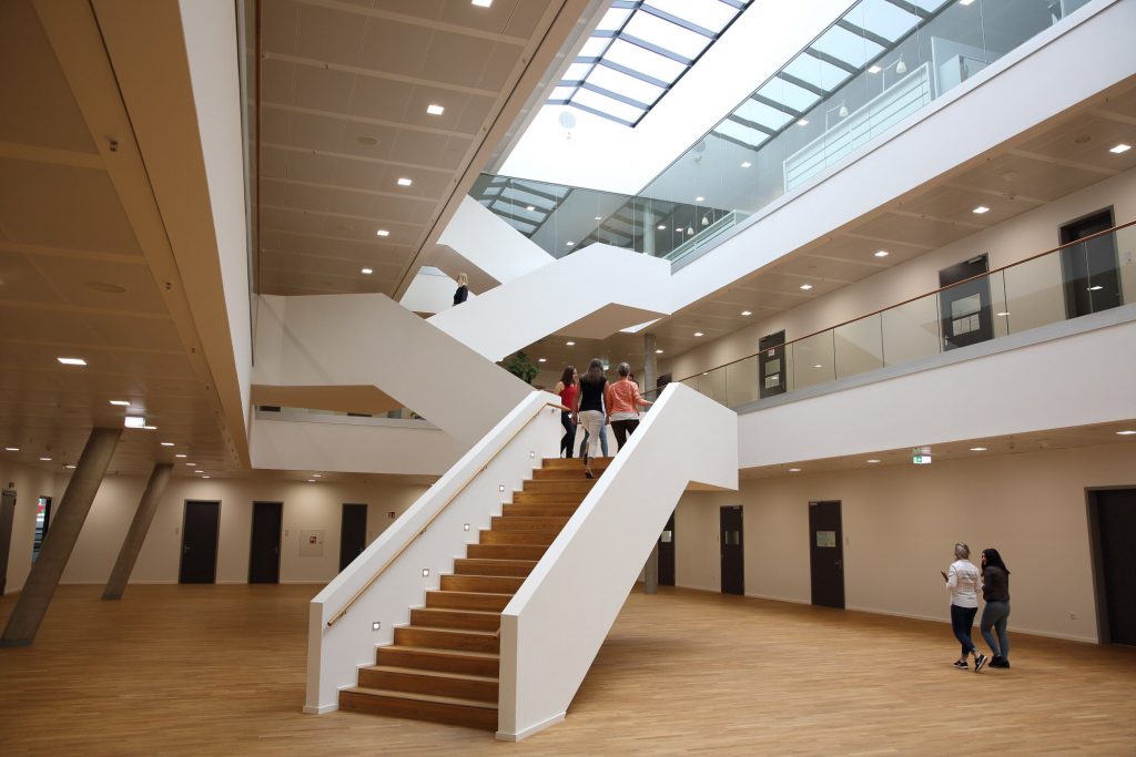 A wide hall with direct access to event spaces welcomes visitors and distributes them via an open staircase to the different floors. Due to the direct public access to the building, the security concept, deliveries as well as goods receipt were designed for a seamless and non-disruptive flow of people and materials. An open, bright and transparent interior design gives the building a welcoming atmosphere. In addition, the open-office concept creates the framework for a flexible working environment.