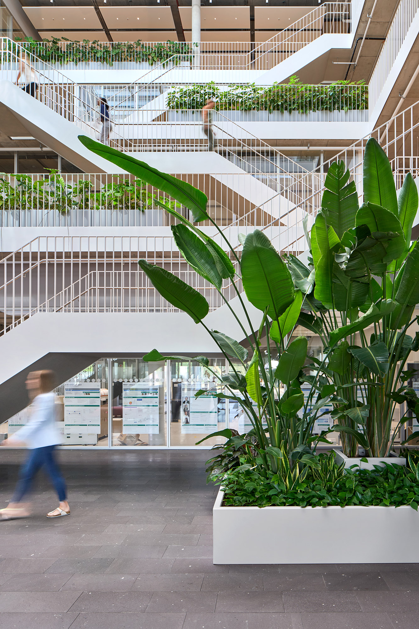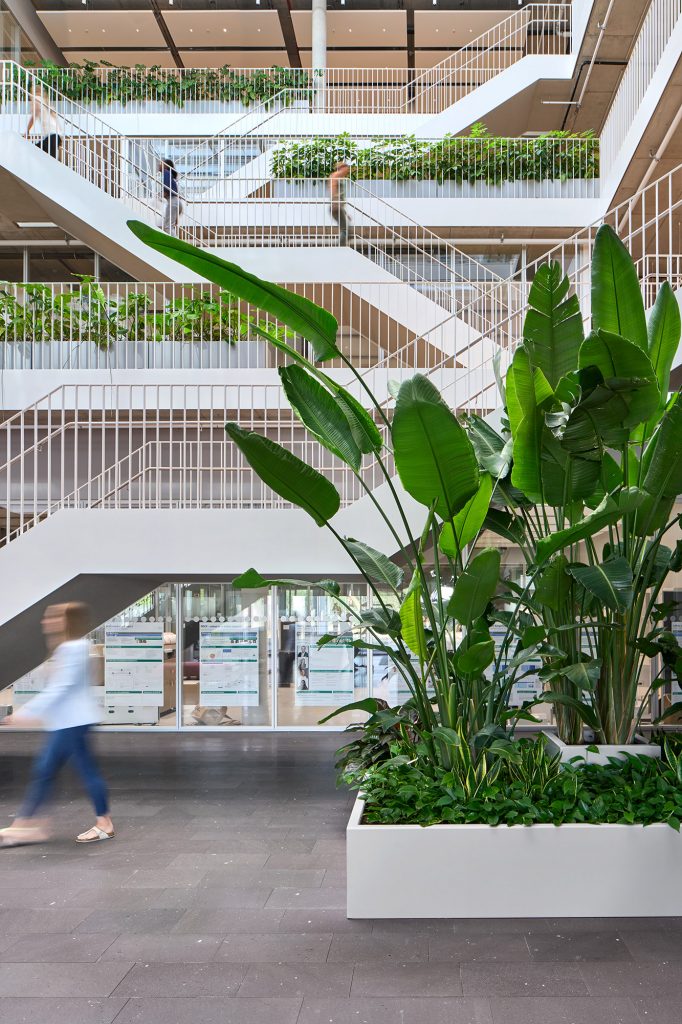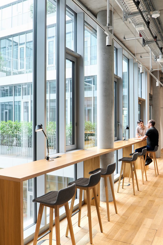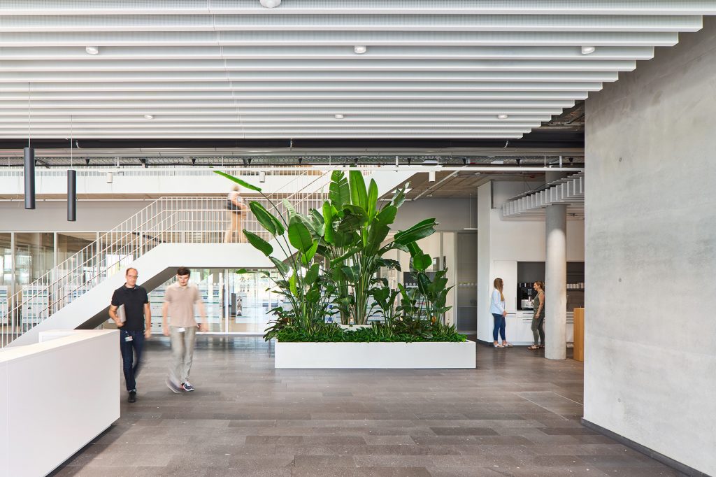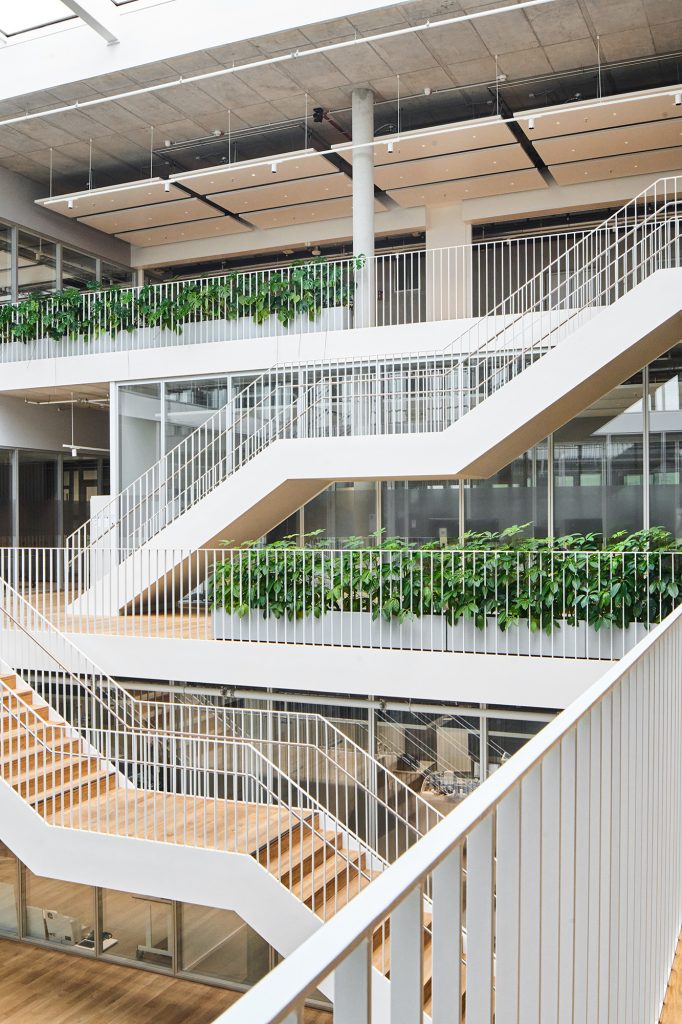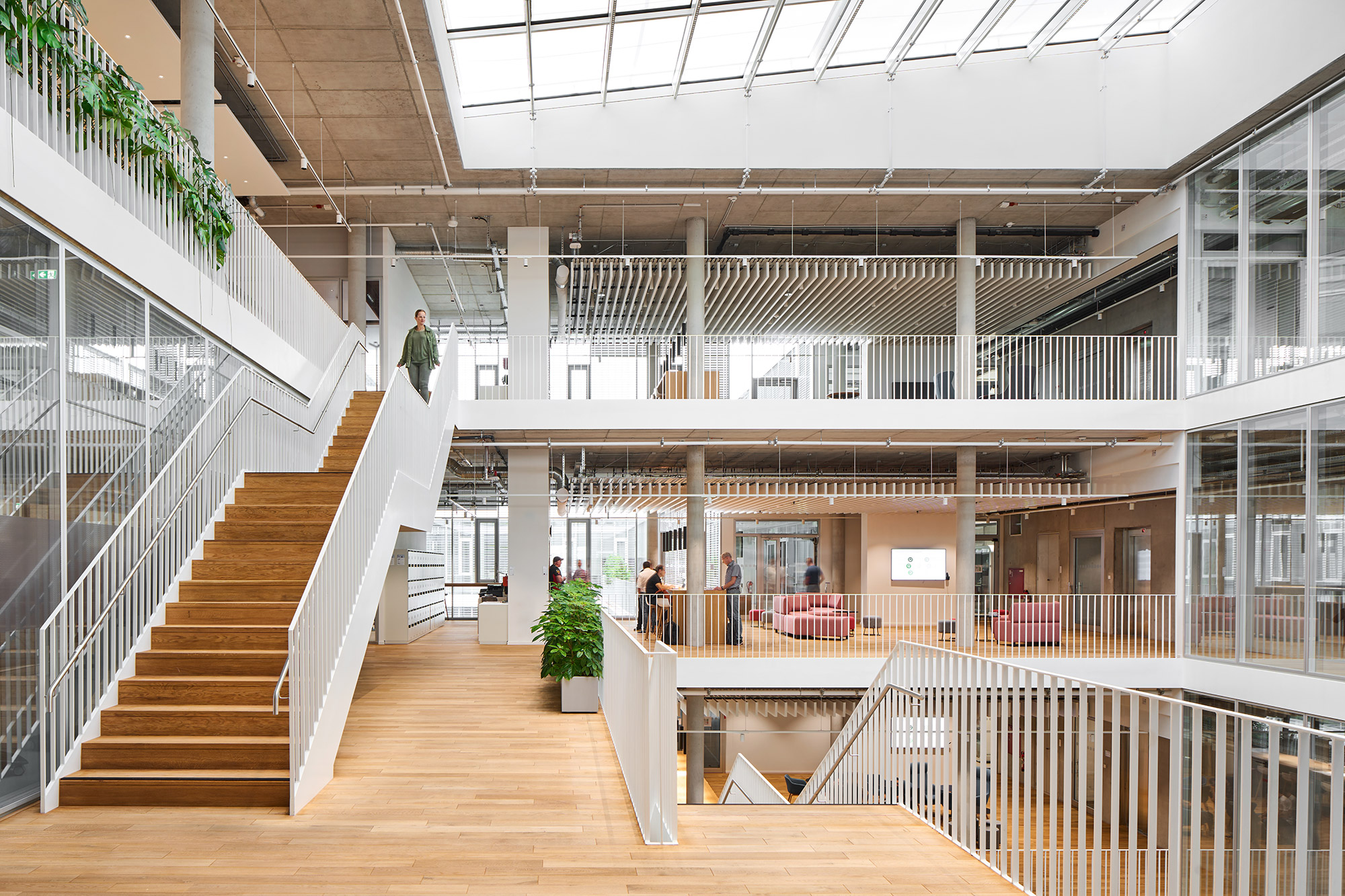 The building is organized around two architectural features, an atrium and an inner courtyard, which establish a central communication zone, open to all floors and flooded with natural light. An elegant filigrane stair provides views across the atrium, creating a sense of openness and transparency over the entire building. The materiality of the interiors is defined by a neutral palette, warm wood and colour accents, and the integration of plants, in alignment with Mannheim interior design concept. Great care has been given to the mostly exposed infrastructure , leveraging the honesty of the building technology to form a refined industrial character.