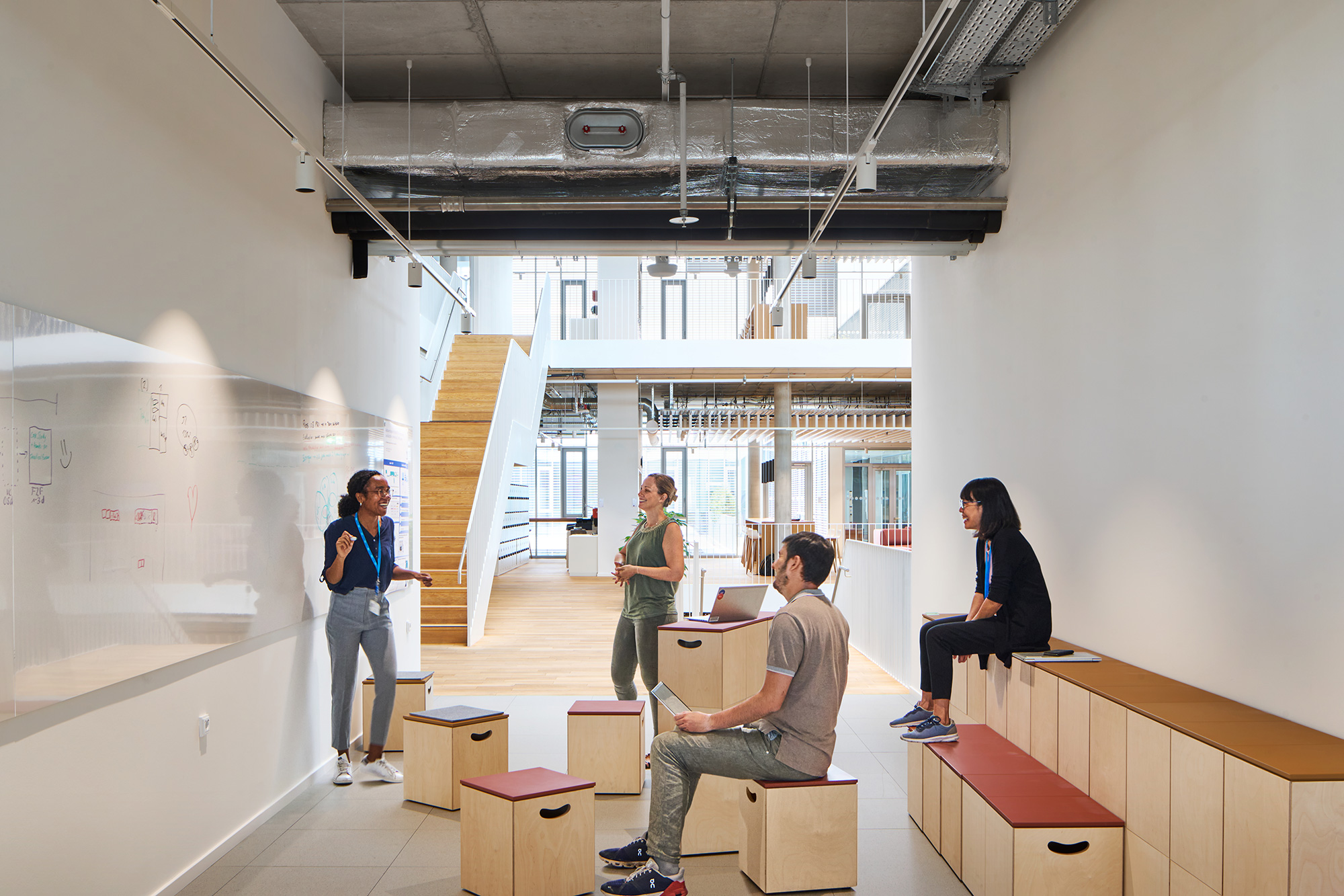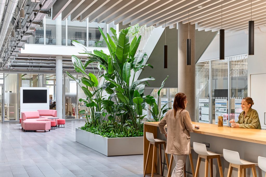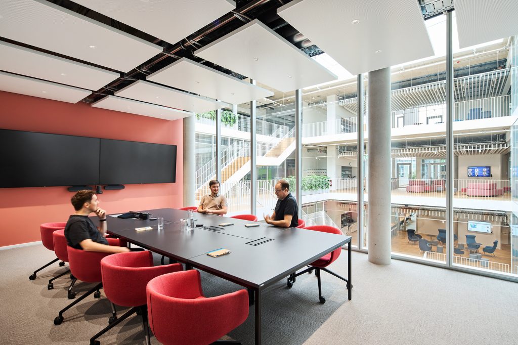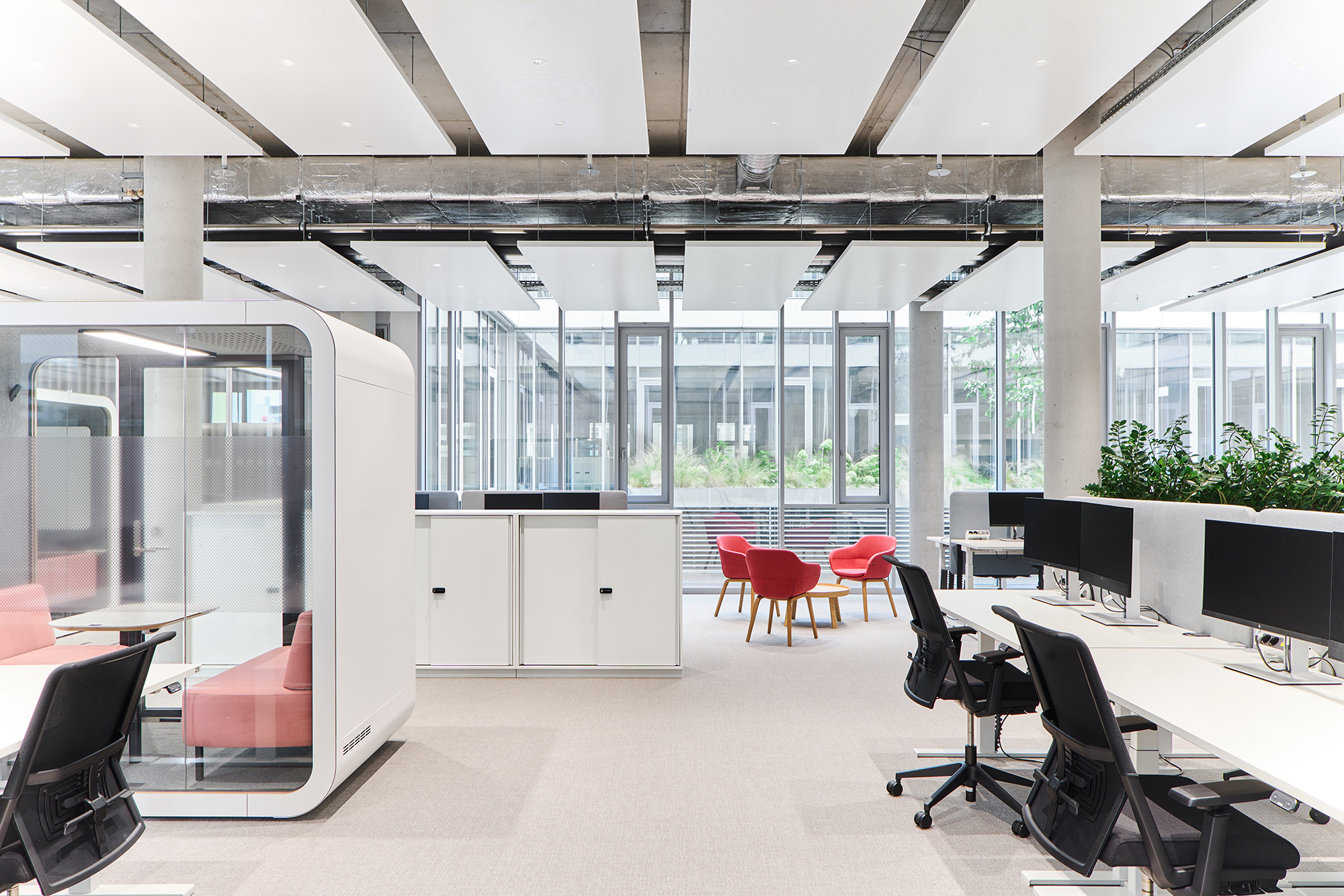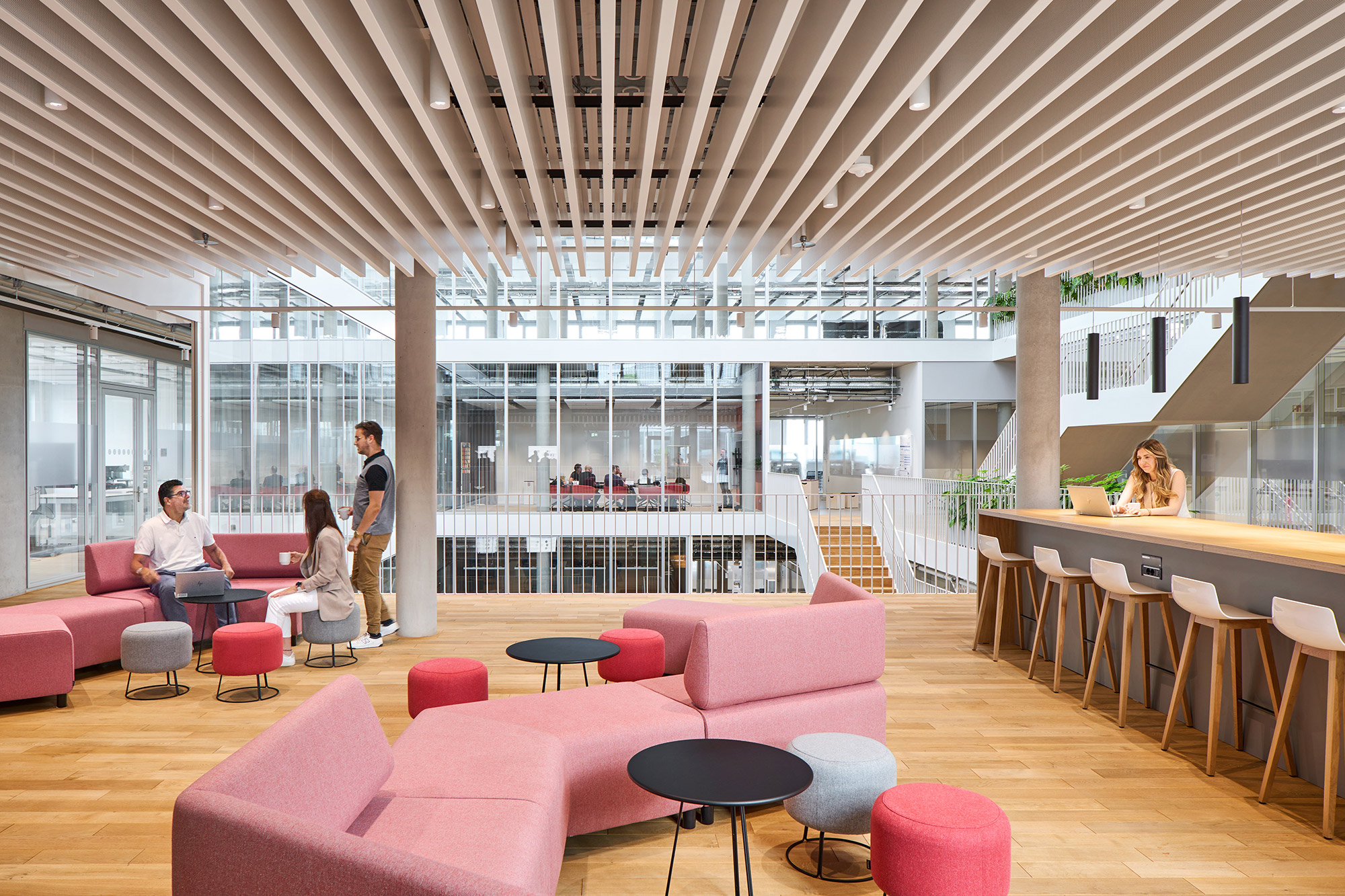 The building is organized around two architectural features, an atrium and an inner courtyard, which establish a central communication zone, open to all floors and flooded with natural light. An elegant filigrane stair provides views across the atrium, creating a sense of openness and transparency over the entire building. The materiality of the interiors is defined by a neutral palette, warm wood and colour accents, and the integration of plants, in alignment with Mannheim interior design concept. Great care has been given to the mostly exposed infrastructure , leveraging the honesty of the building technology to form a refined industrial character.