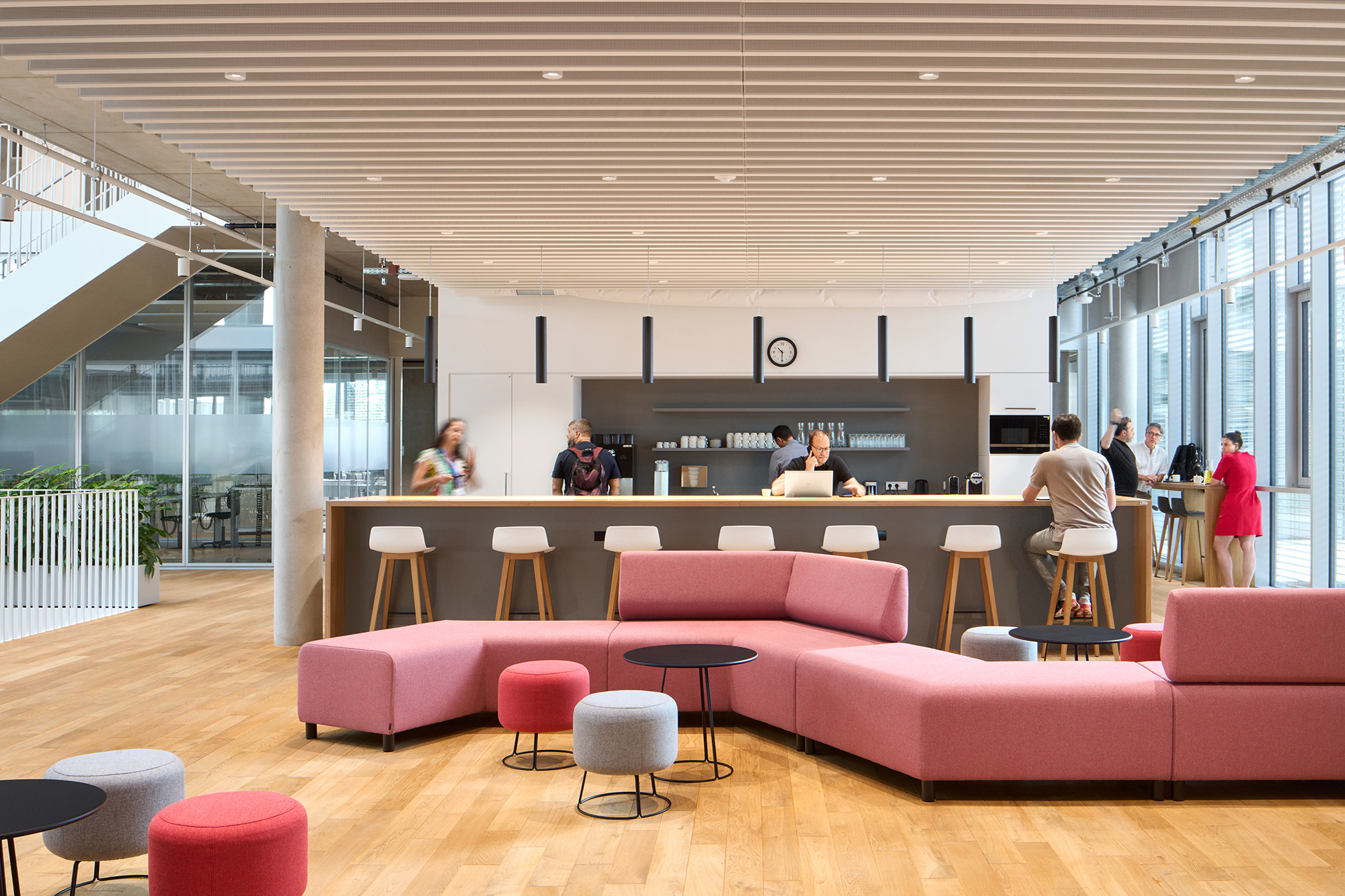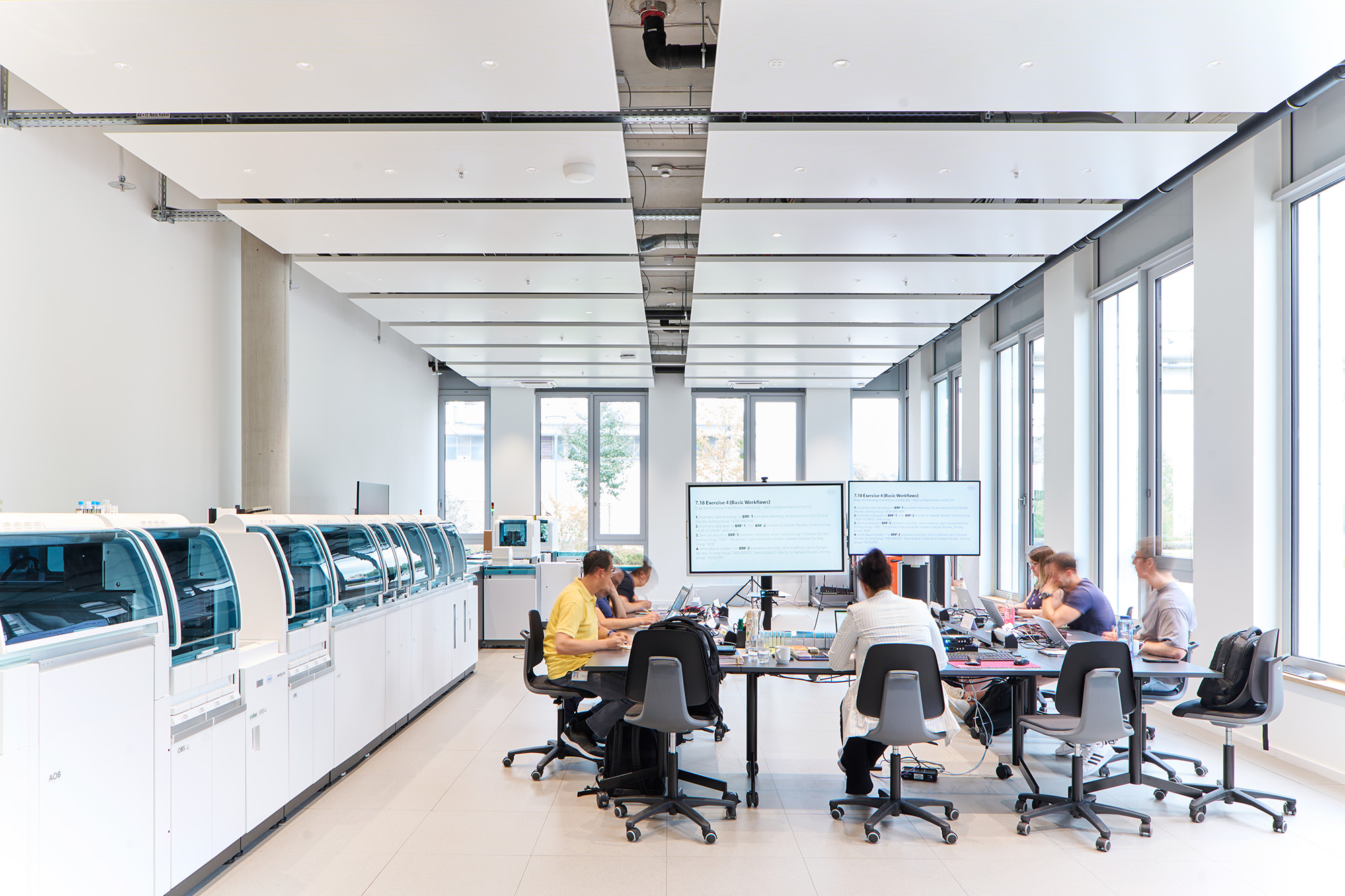 The workplace strategy, introduction of new ways of working and sharing concepts, for offices and training rooms for diagnostics cobas, allowed for an optimization of the space demand. The deep floor plate provides highly flexible spaces, which can be used for offices, training rooms or laboratories with an ease of adaptability in the short term.