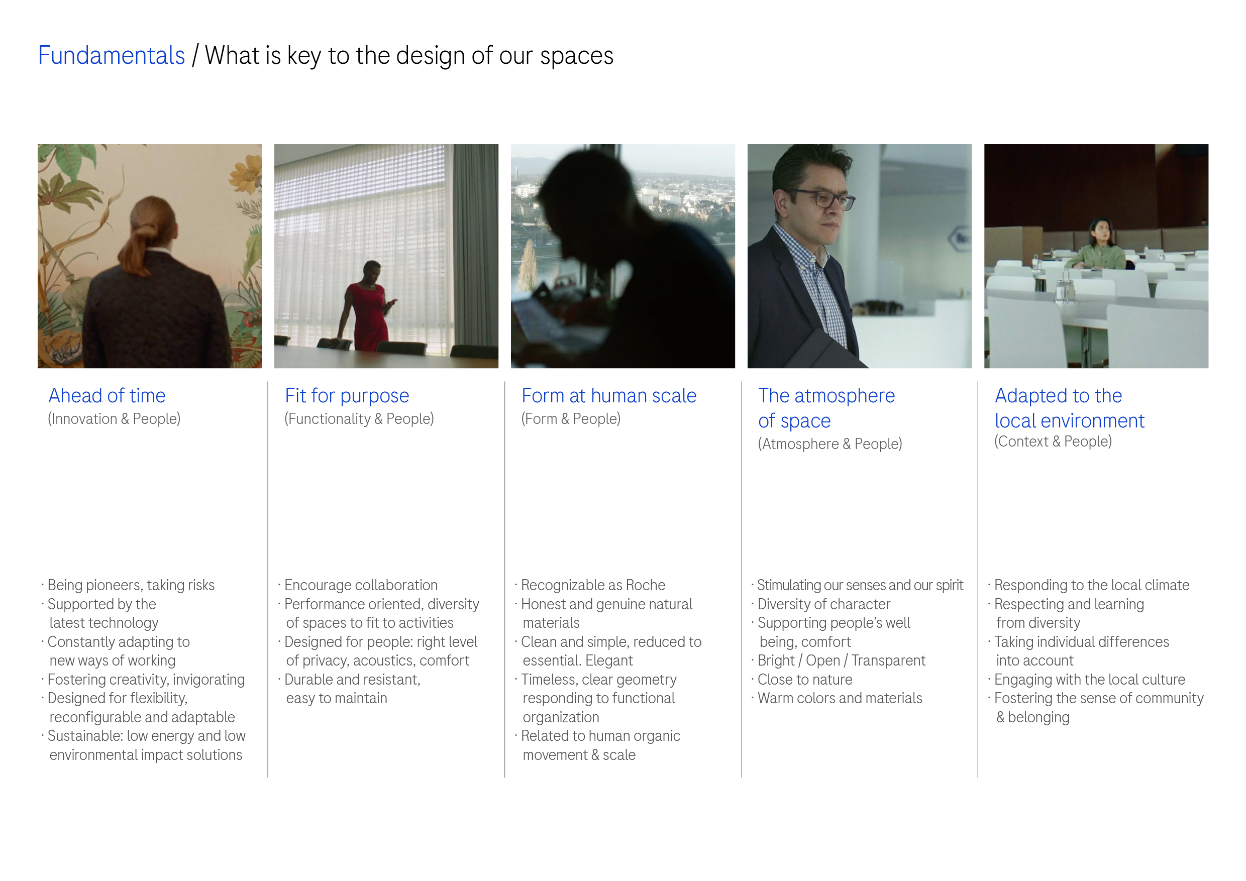 This design guide, explains and illustrates Roche's architectural fundamentals. Clear, functional structures and spartan elegance, relating to the local context, new technologies and the focus on people and sustainability are essential to Roche's approach to the design of our spaces.